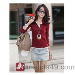 Amanda49 Button Design with Collar Cotton Red Long Sleeves Blouse--Women's Blouses |