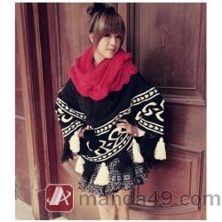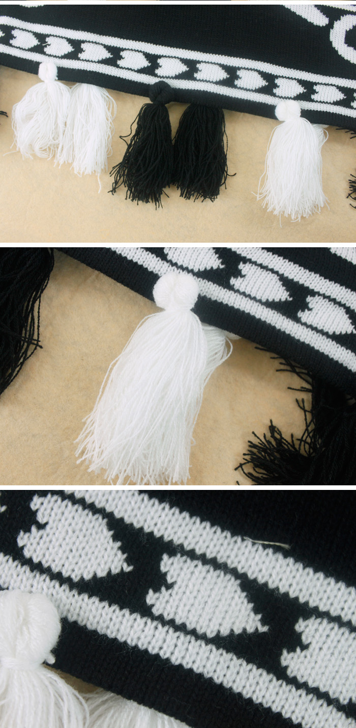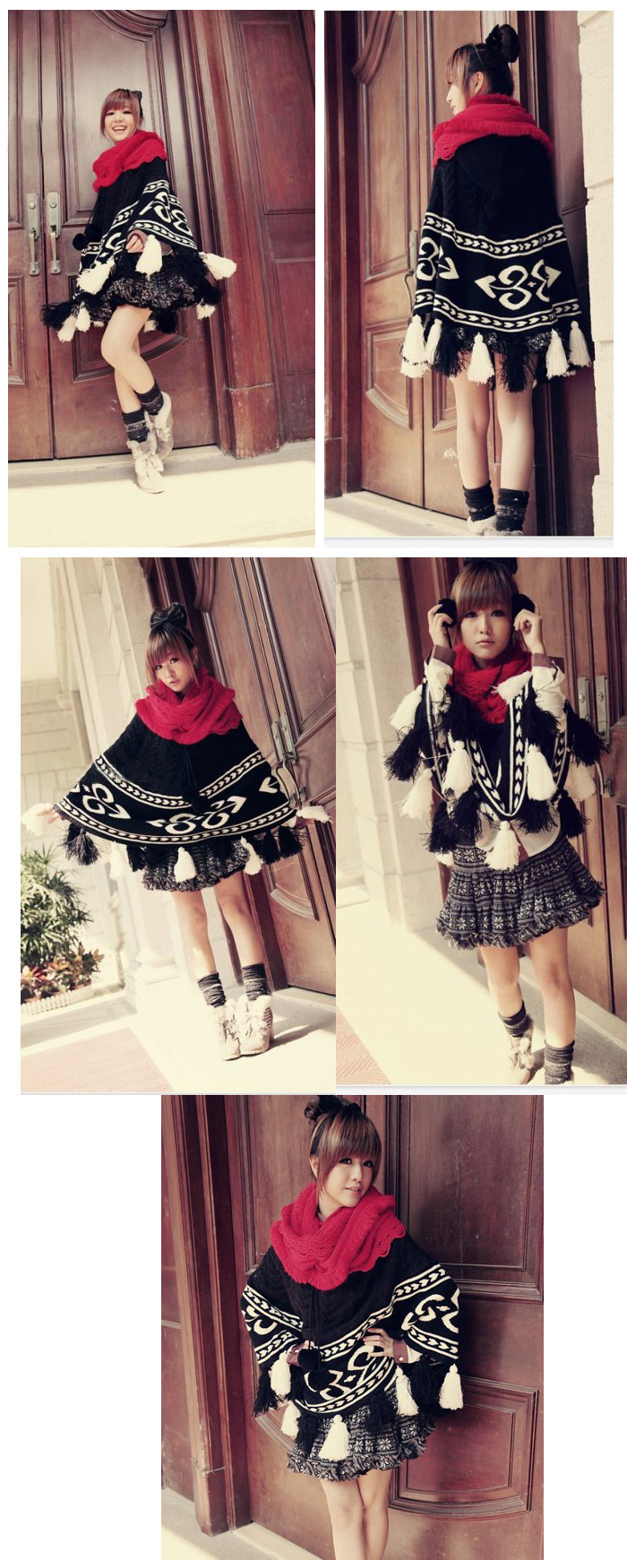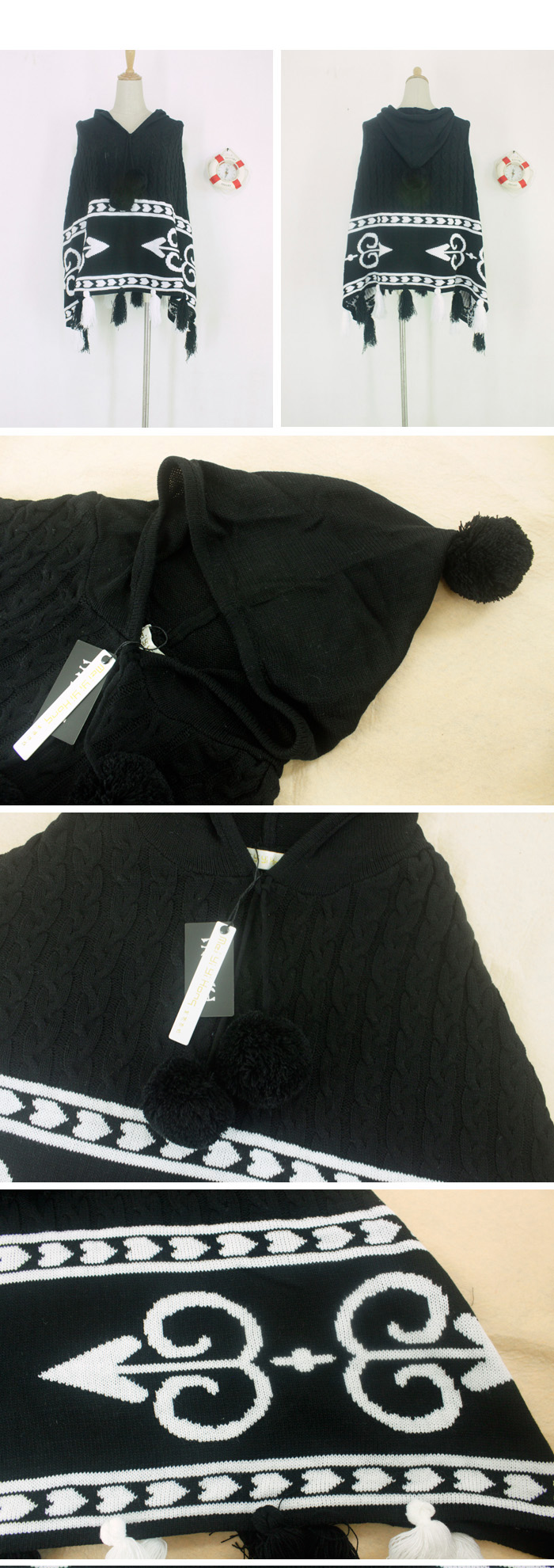 Amanda49 Cute Wool Ball Pendant Poker Patterns Double Color Tassel Black Acrylic Cloak For Women |