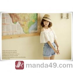 Amanda49 Elastic Collar design White Lace Short Sleeve Blouse--Women's Blouses |