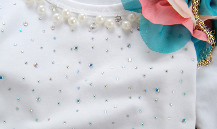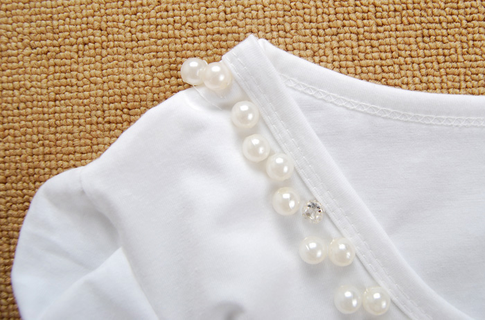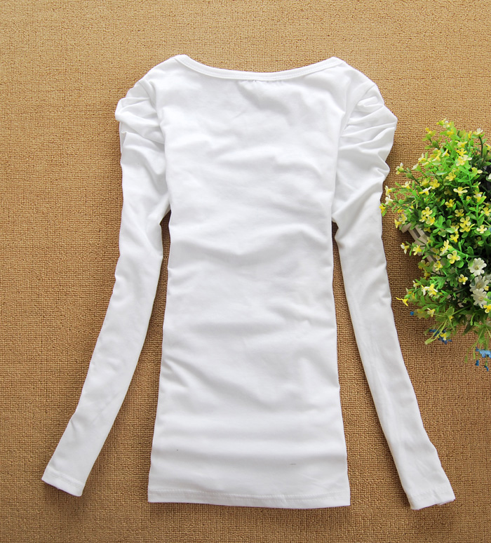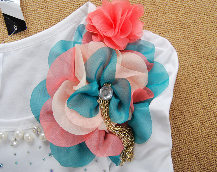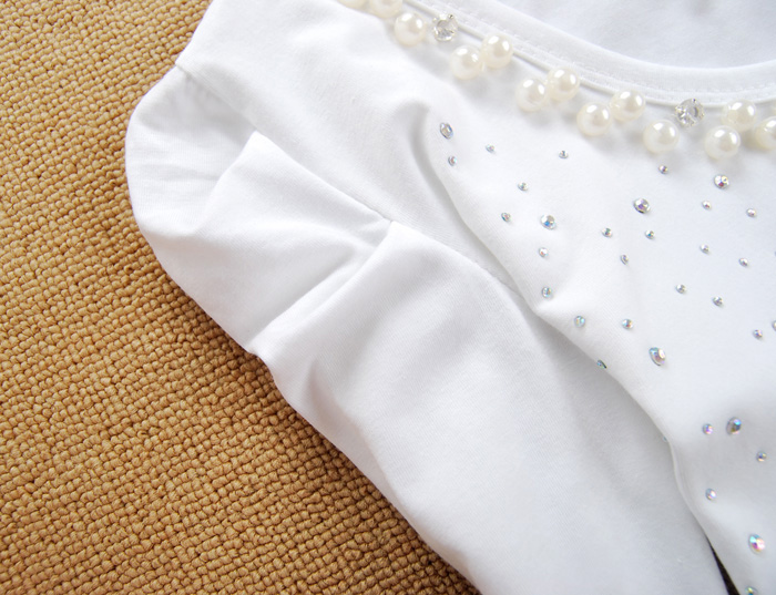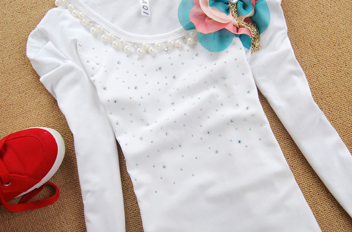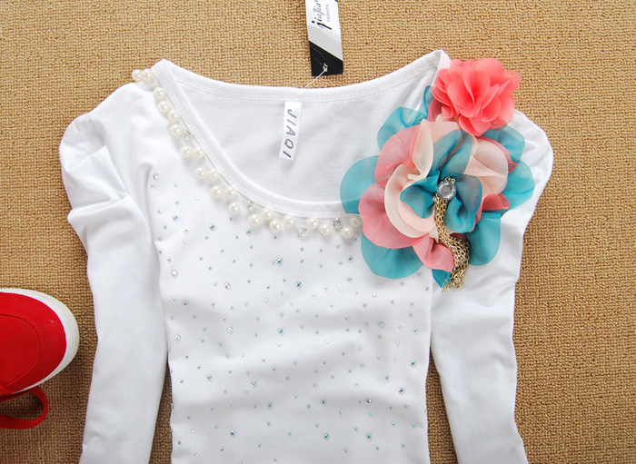 Amanda49 Elegant Round Beads Collar Colorful Flower Embellished Shoulder White Long Sleeves Cotton T-Shirt For Women |