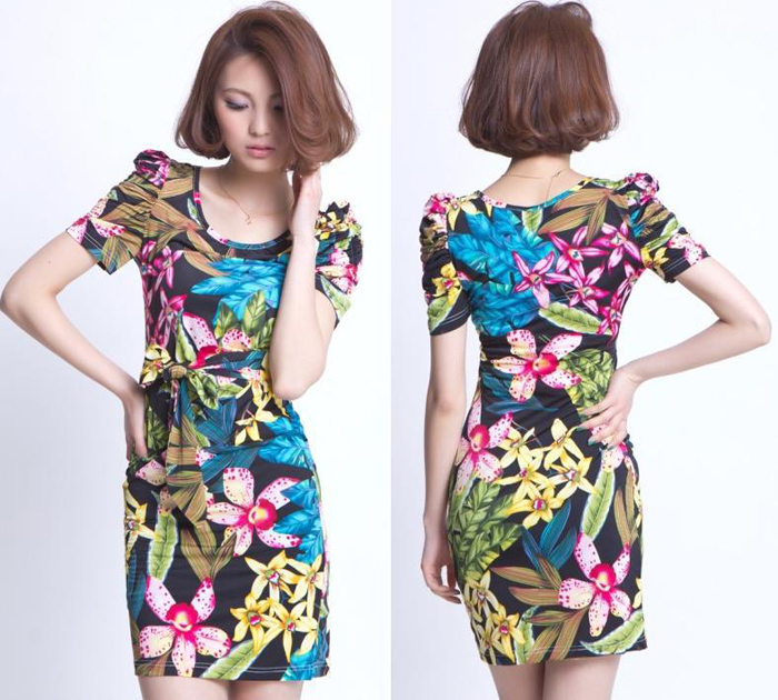 Amanda49 Exquisite and Slim Round Neckline Flowers Pattern Puff Sleeves Milk Silk Dress--Women's Dresses |