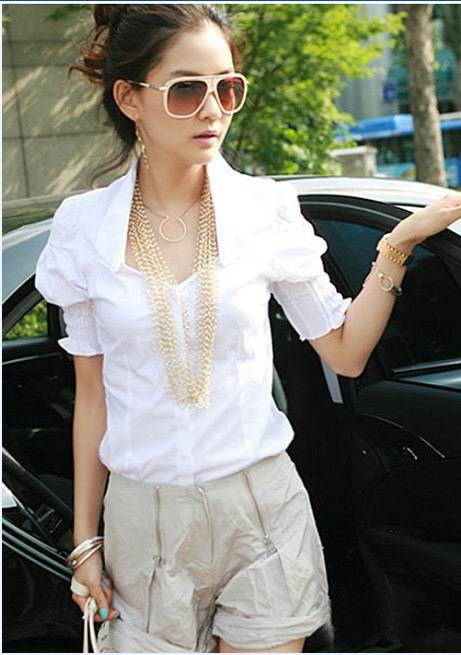Amanda49 Exquisite and Slim V-Neck White Puff Sleeves Cotton Fabric Blouse For Women |