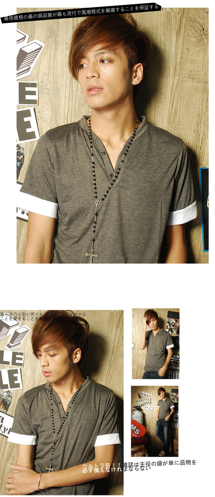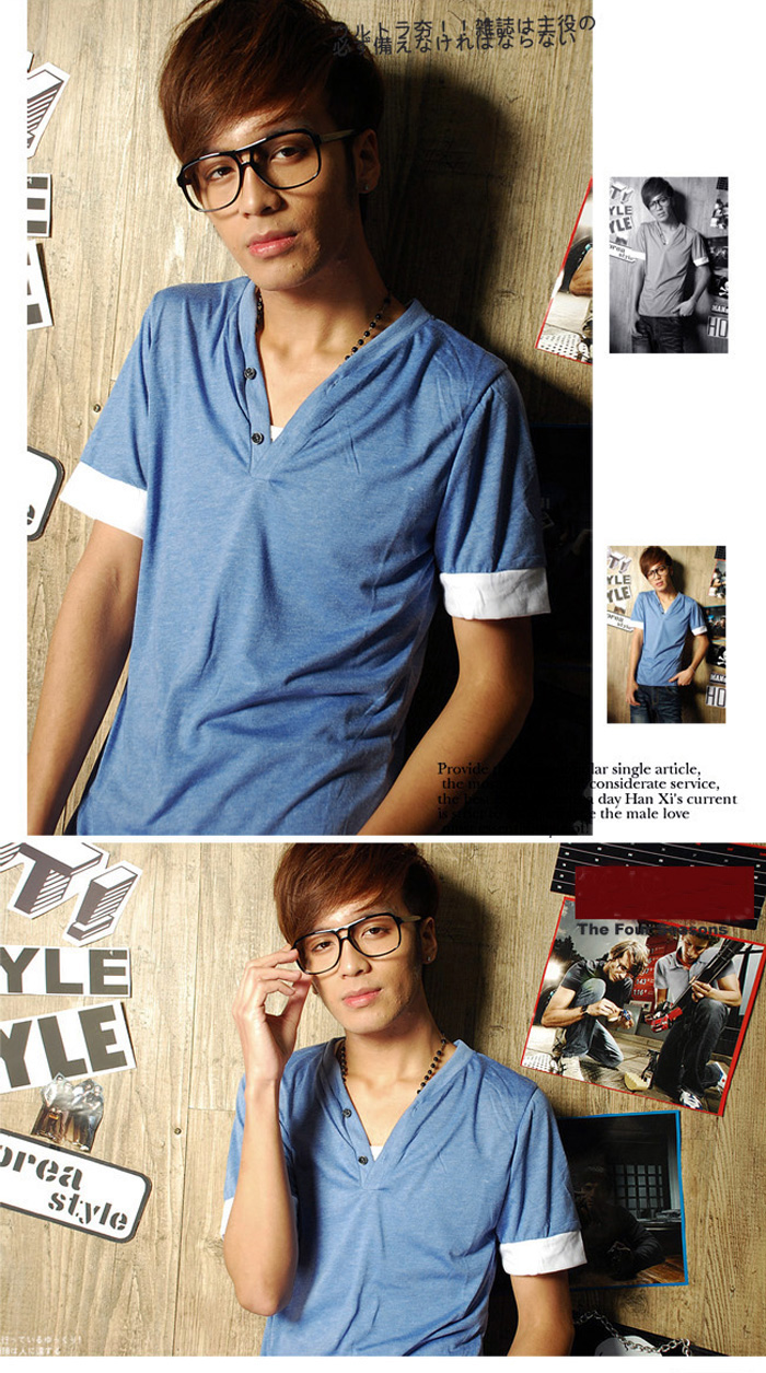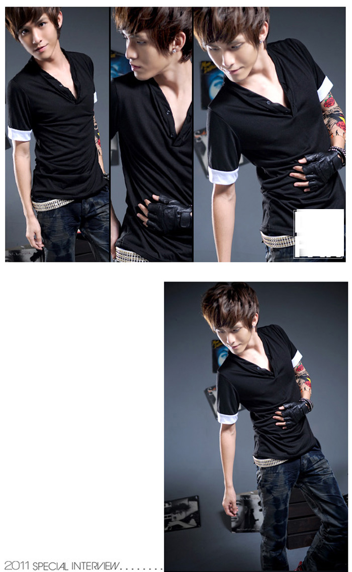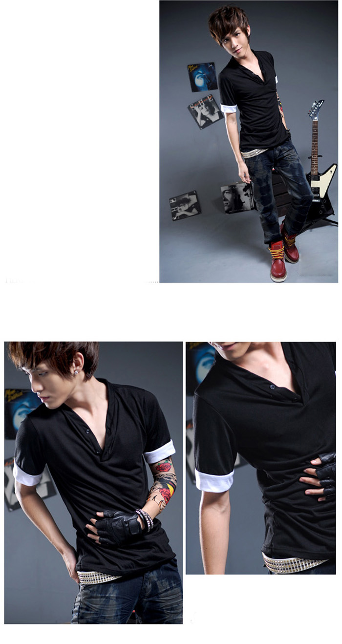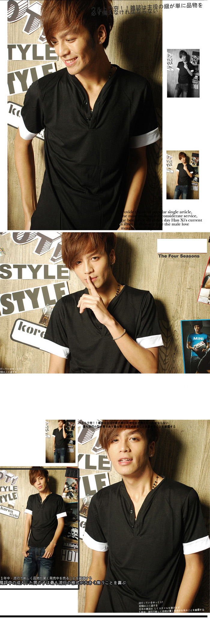 Amanda49 Fashion and Casual Style V-Neck and Button Decorated Color Matching Design T-shirt For Man |
