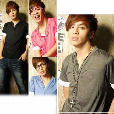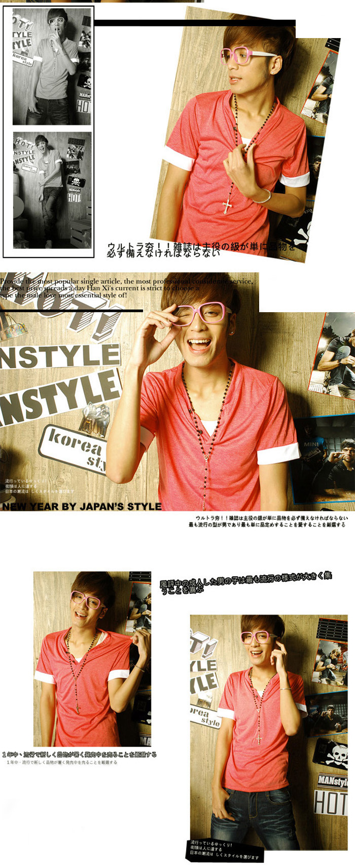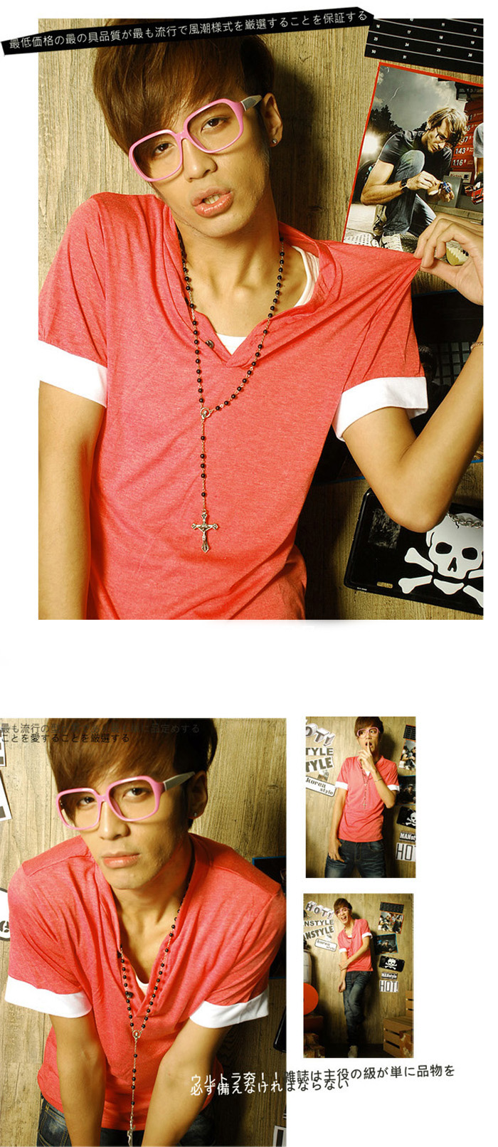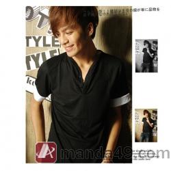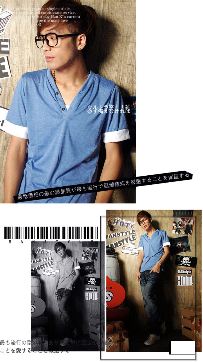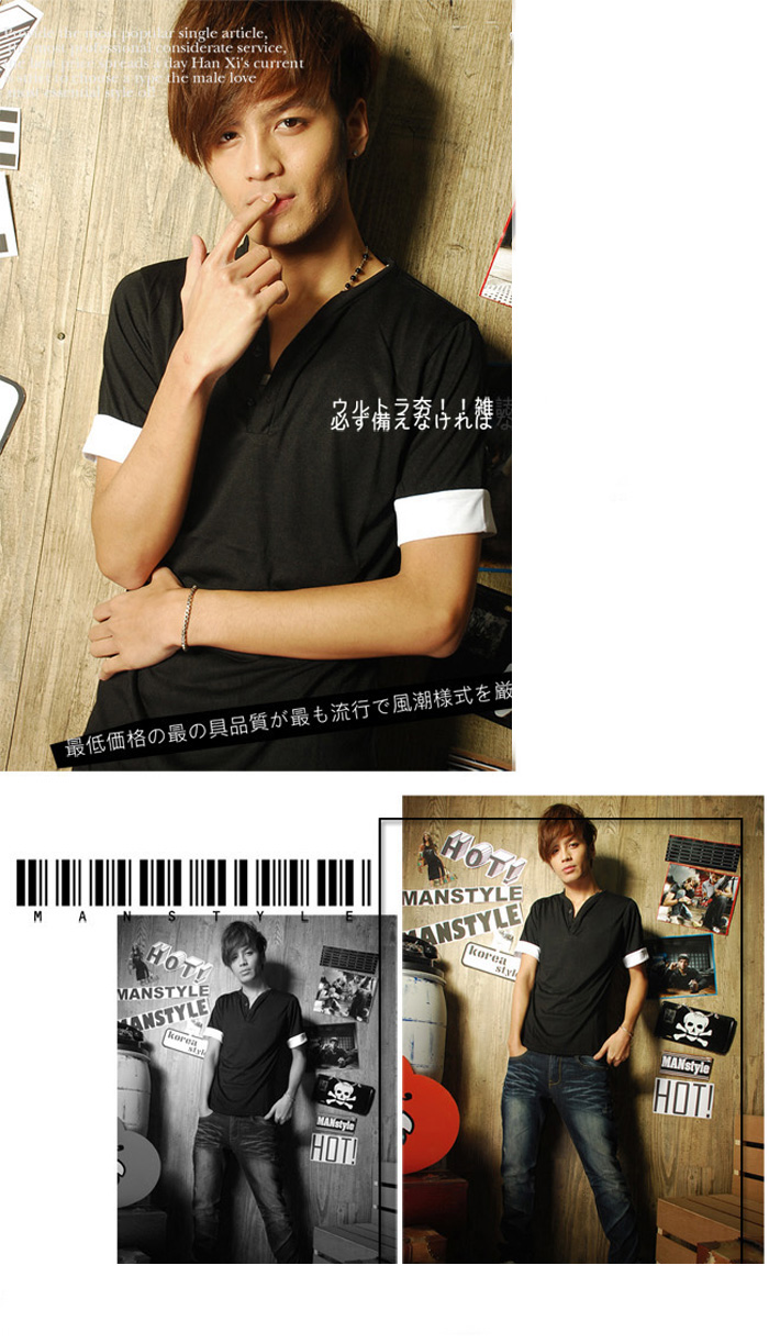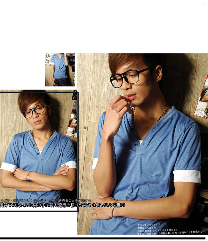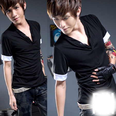 Amanda49 Fashion and Casual Style V-Neck and Button Decorated Color Matching Design T-shirt For Man |