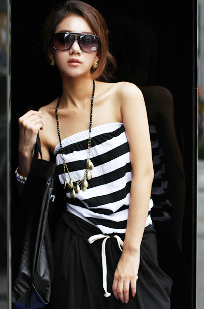 Amanda49 Fashionable Black and White Stripe Patterns Stitching Jumpsuit |