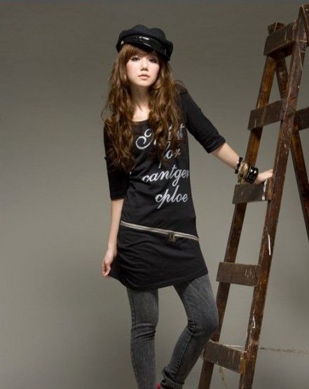 Amanda49 Fashionable Letter Patterns Casual Style Round Neckline Short Sleeve Long T-Shirt |