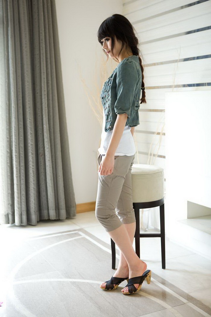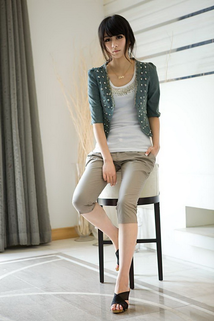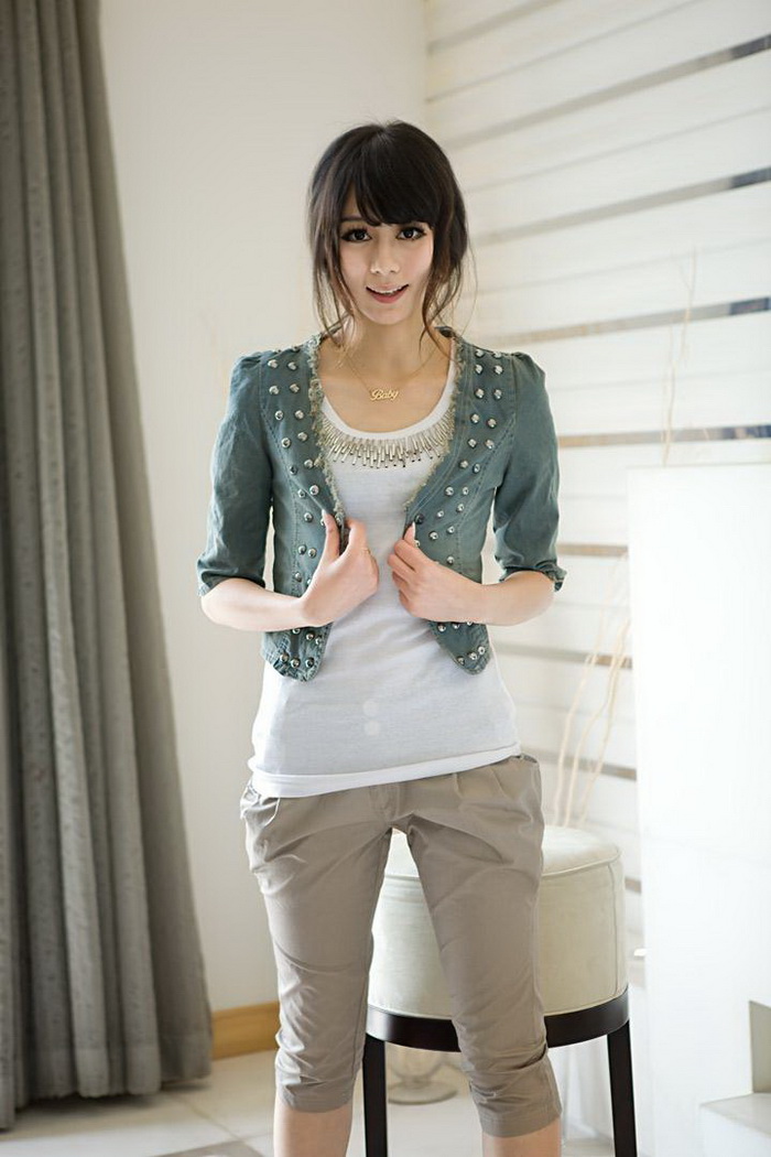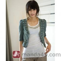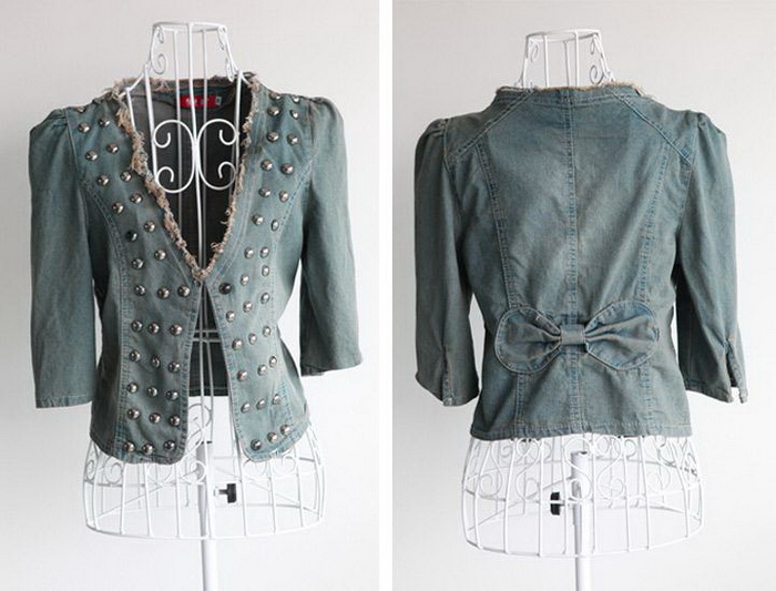 Amanda49 Fashionable Rivets Embellished Blue Quarter Sleeves Jeans Coat For Women |