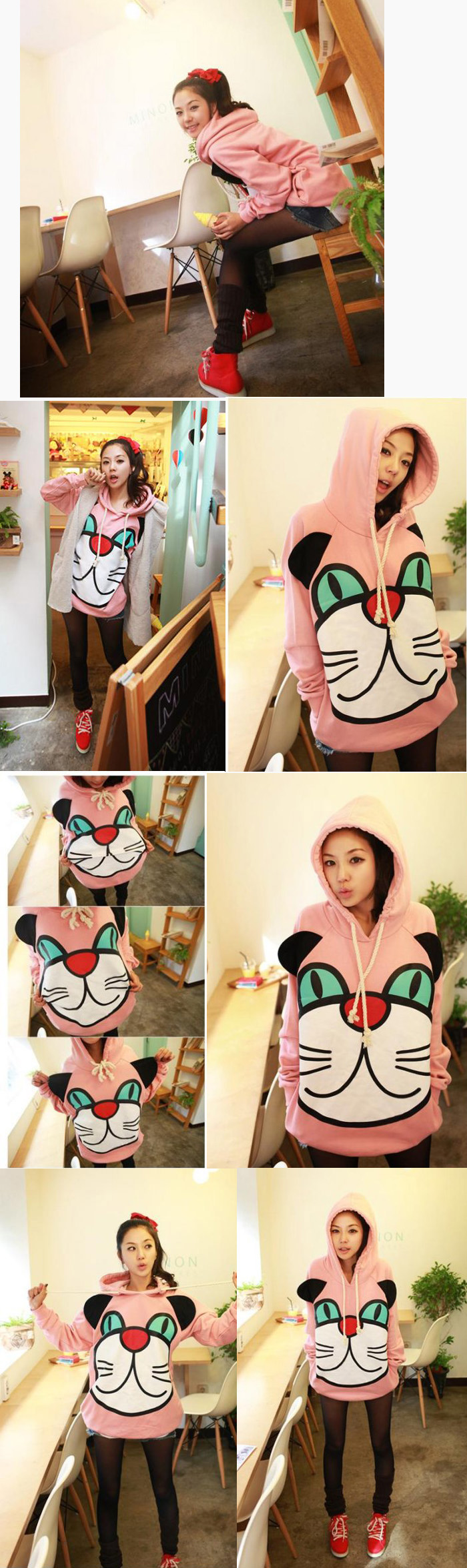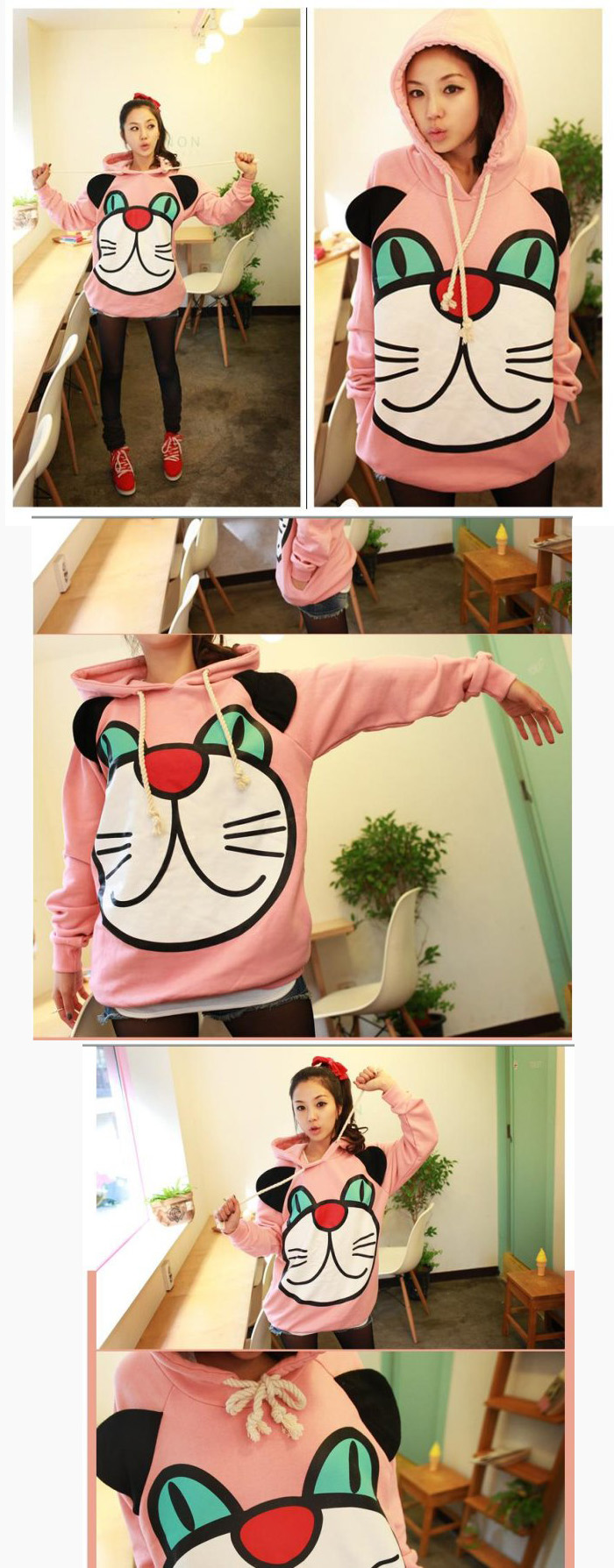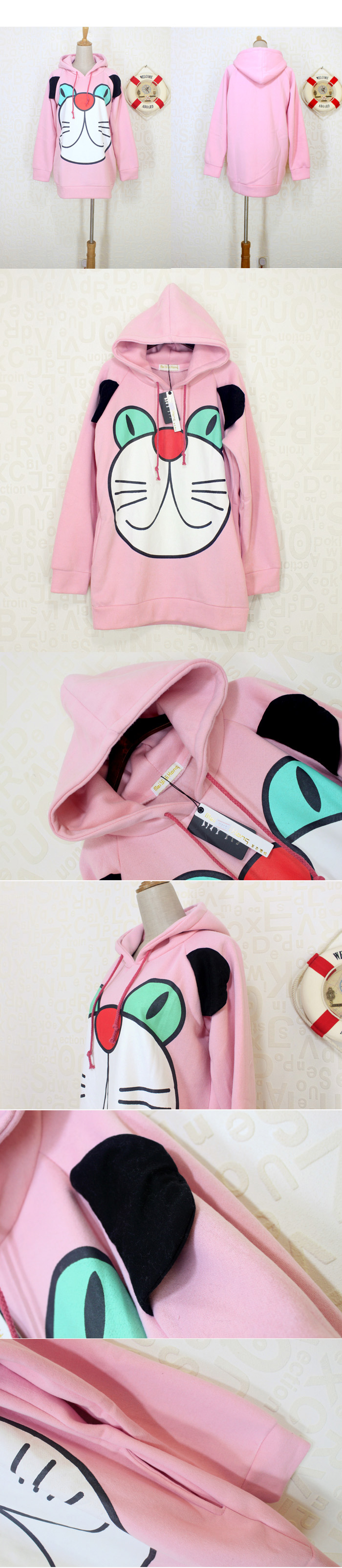 Amanda49 Funny and Sweety Big Face Cartoon Cat Patterns Pink Long Sleeves Cotton Blouse For Women |