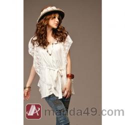 Amanda49 Gentlewomanly White Cotton + Lace Butterfly Sleeves Design with Belt Blouse for Women |