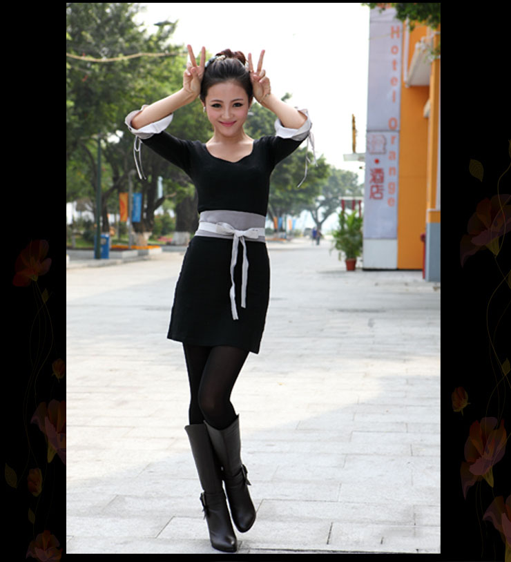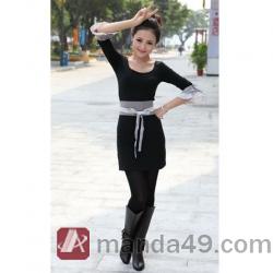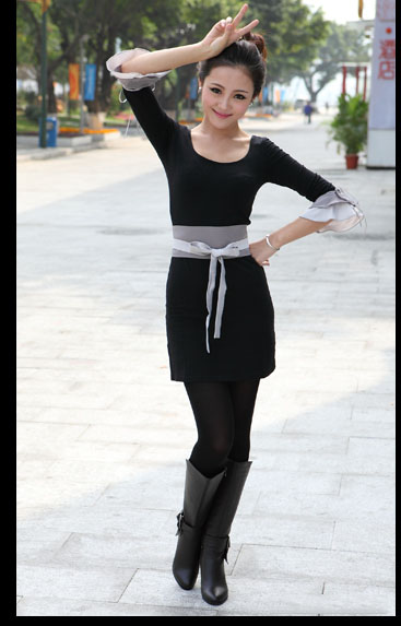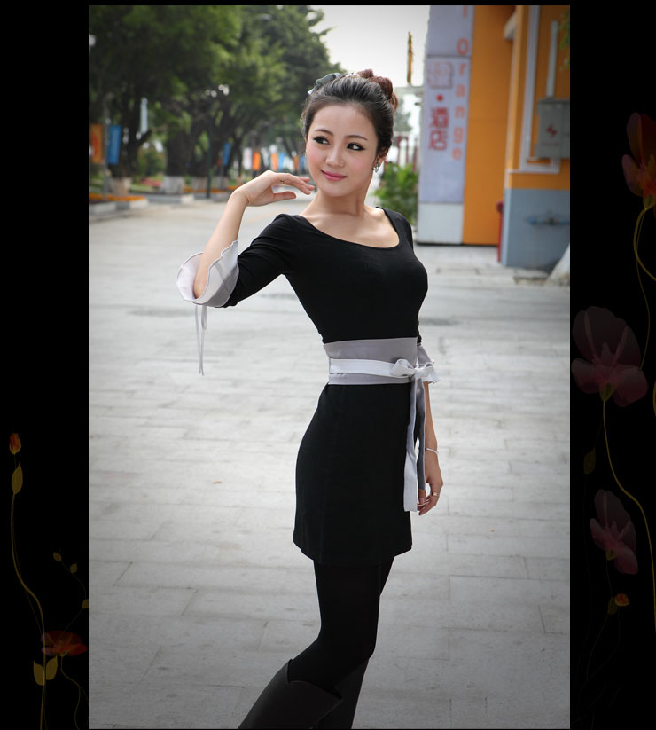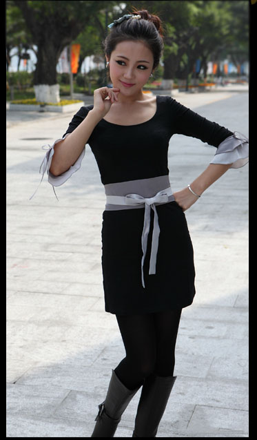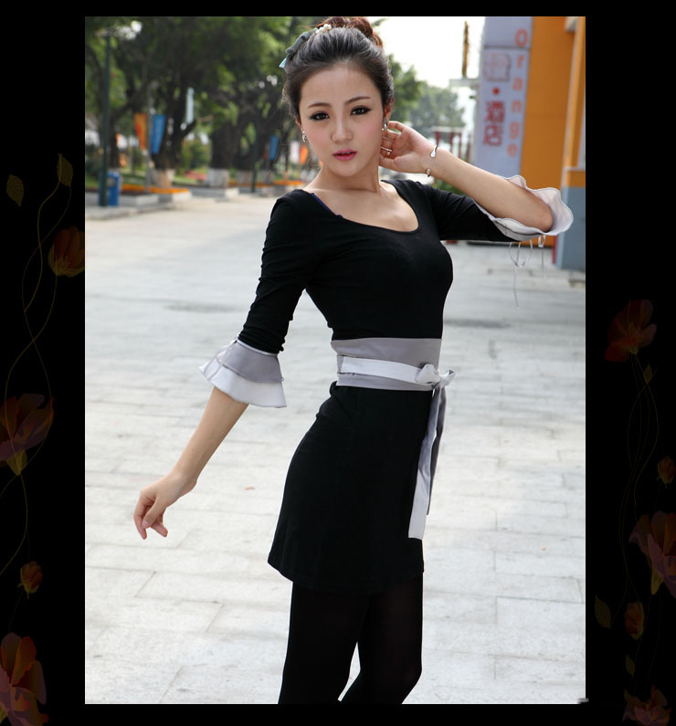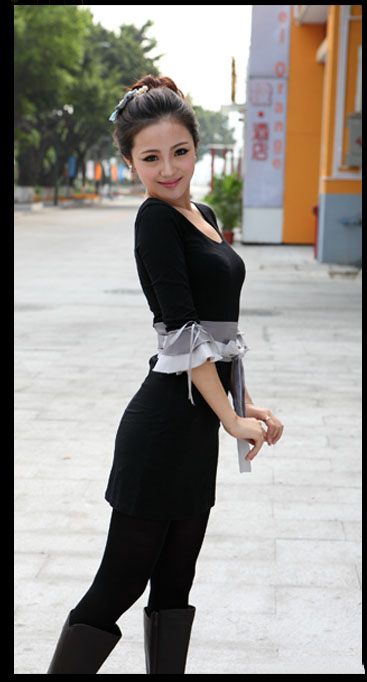 Amanda49 Graceful and Fitness Round Neckline Cuff Lotus Leaf Design Black Cotton+Imtated Silk Dress |