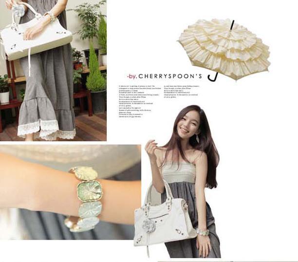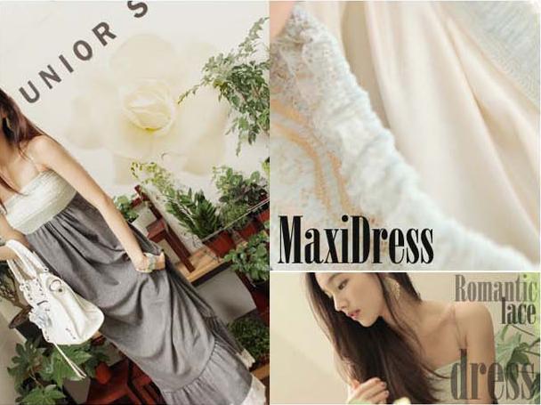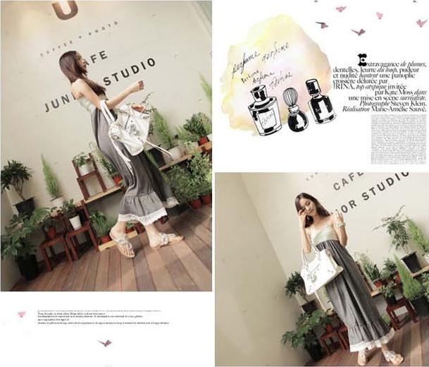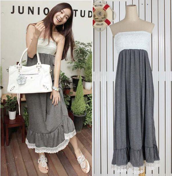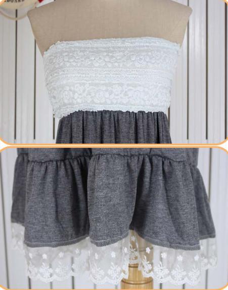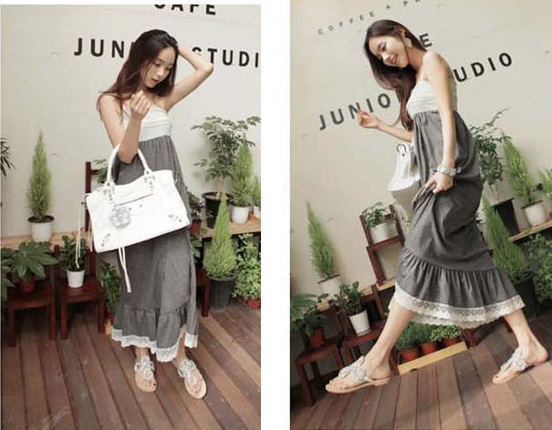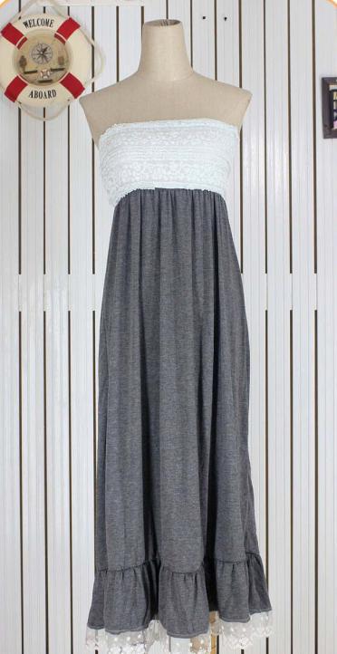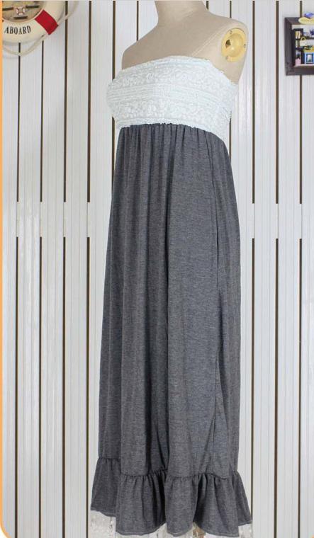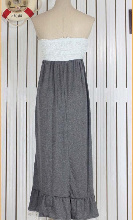 Amanda49 Hign Elastic Waist Lace Hem Design Gray Cotton Dress |