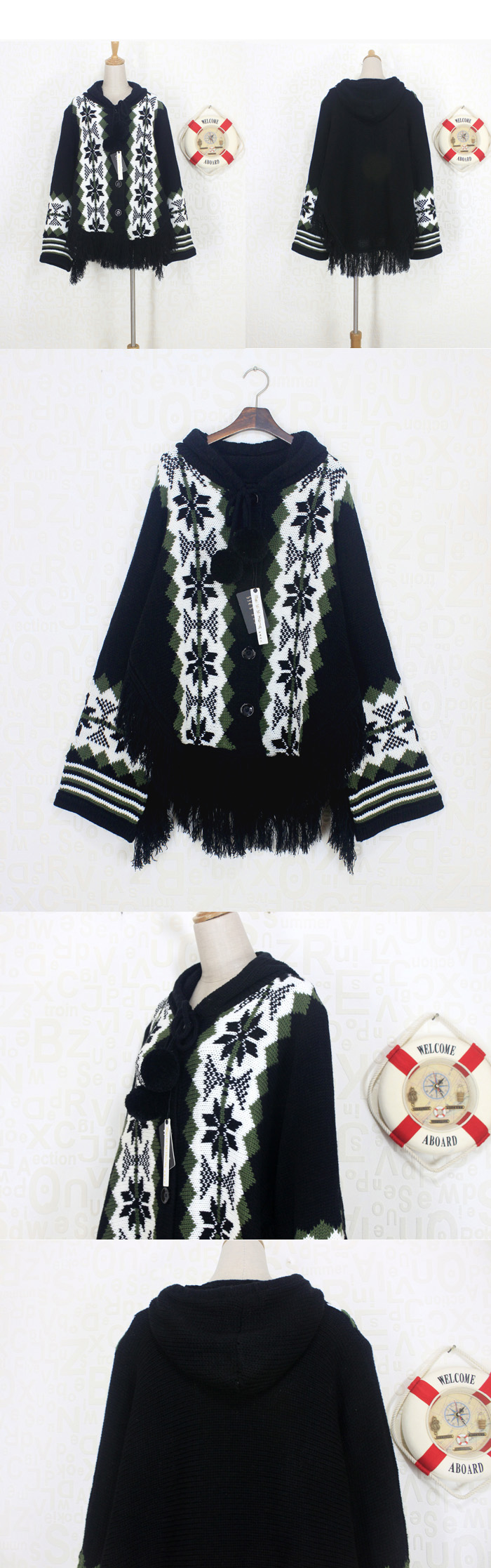 Amanda49 Korea Style National Vertical Patterns Tassel Black Bat-Wing Long Sleeves Acrylic Cloak For Women |