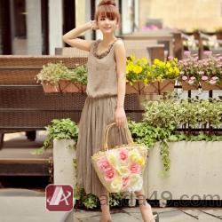 Amanda49 Laconic and Comfortable Elastic Waist Design Gray Cotton Long Dress--Womem's Dresses |