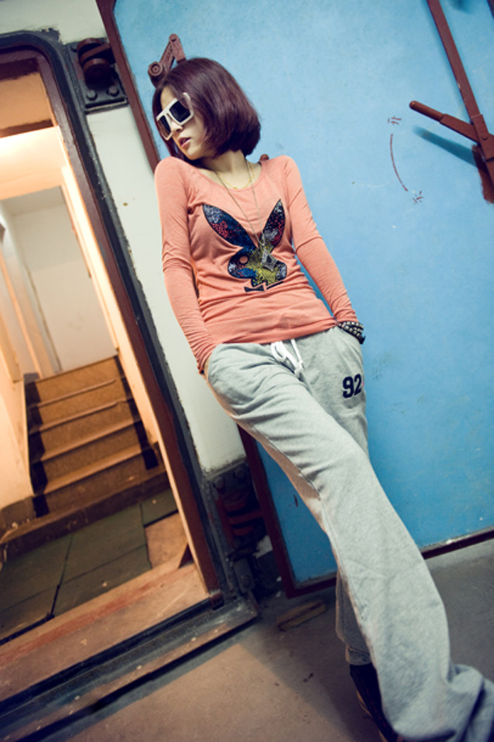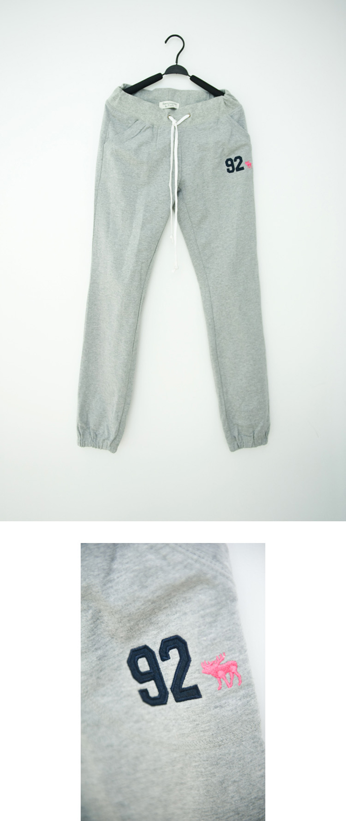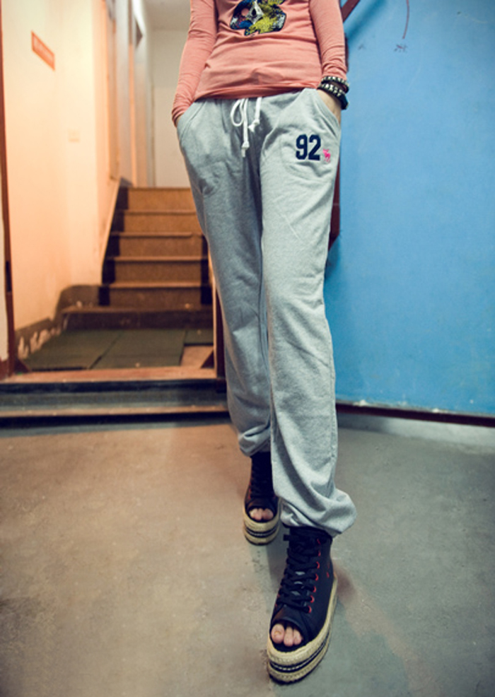 Amanda49 Leisure Number 92 Patterns Lace-Up Light Grey Cotton Trousers For Women |
