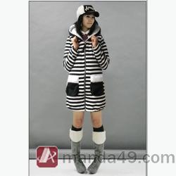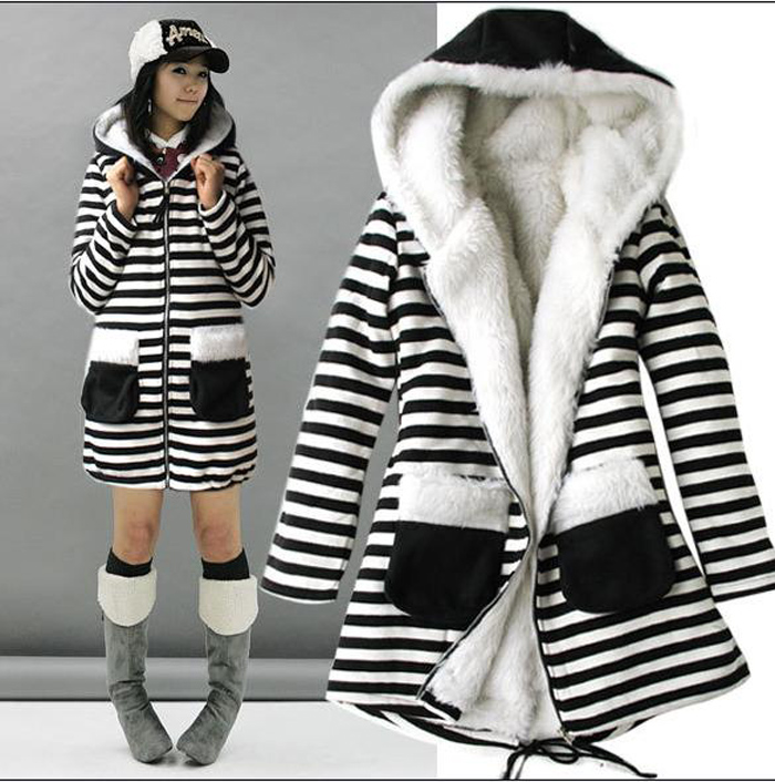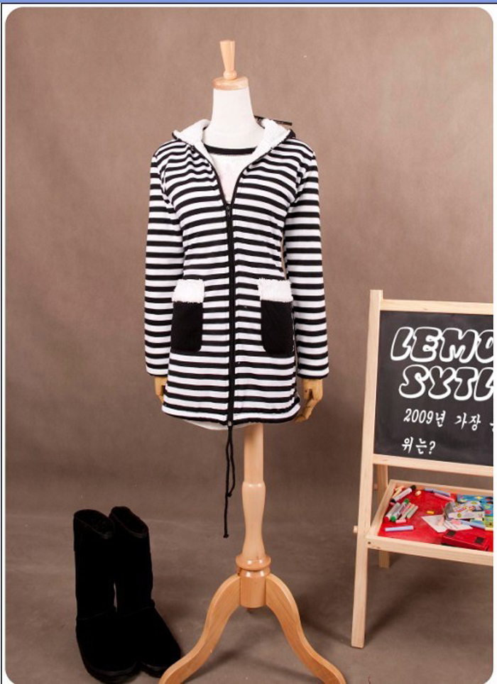 Amanda49 Lovely and Warmly Stripes Pocket Cotton Hood Long Coat For Women |