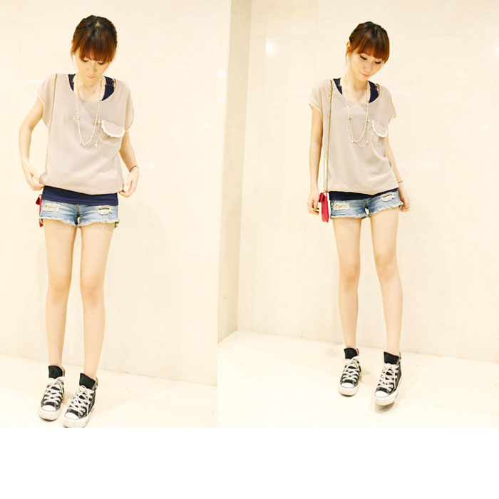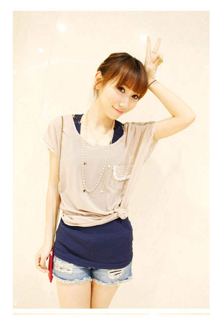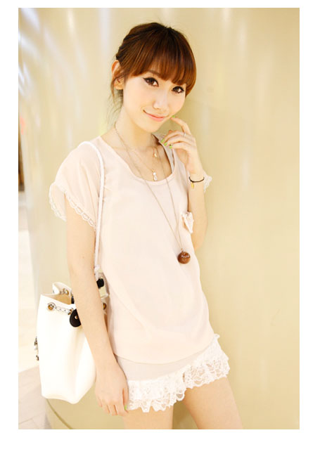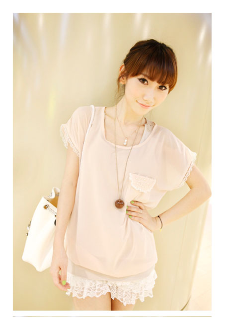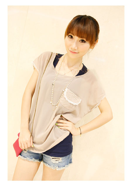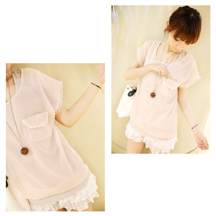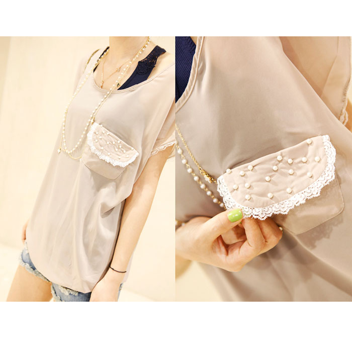 Amanda49 Lovely Round Neckline Special Pocket Style Pearl Embellished Chiffon Blouse For Women |
