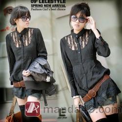 Amanda49 Mesh Design Nitrile Cotton + Lace Black Long Sleeves Blouse--Women's Dresses |