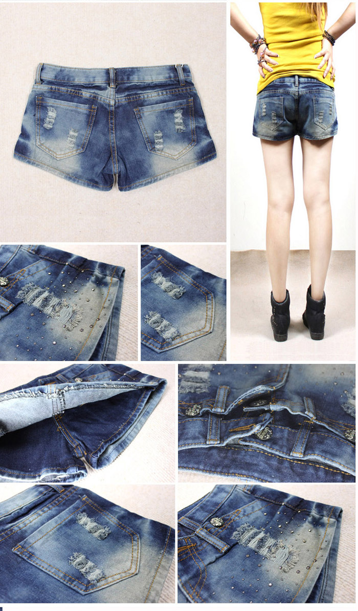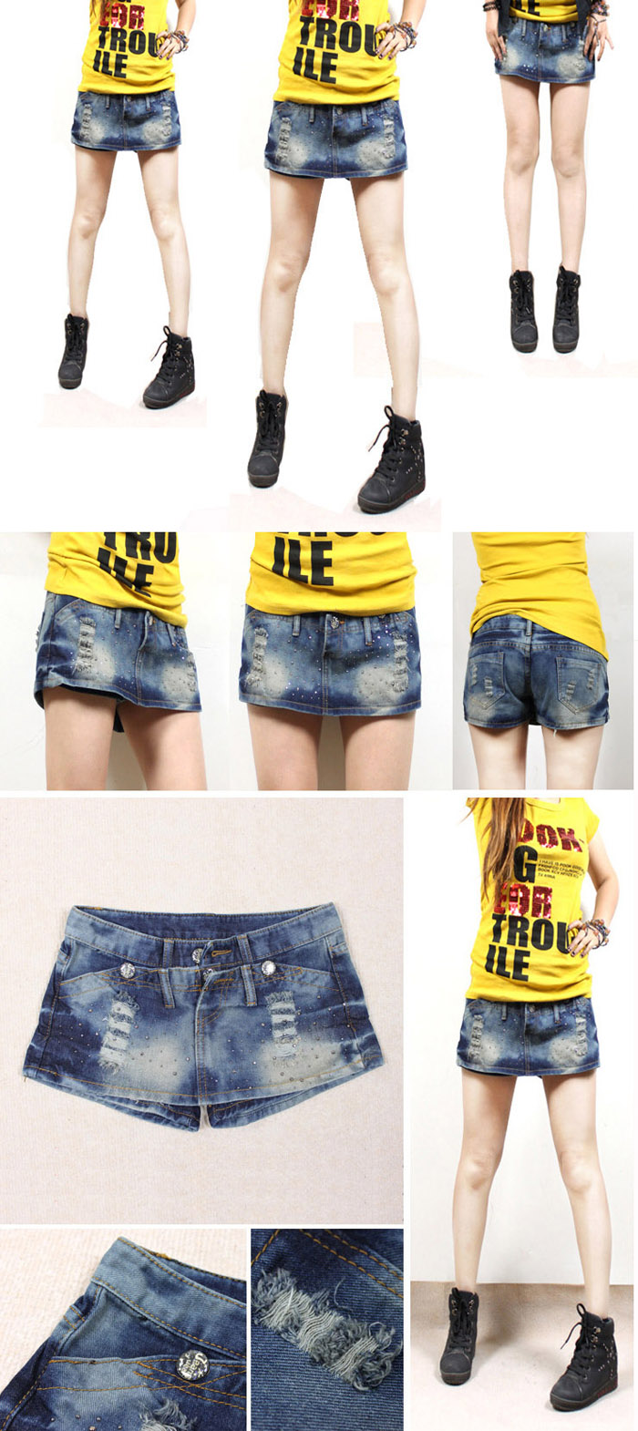 Amanda49 Mix Match Rhinestone Scratch Embellished Low Waist Layered Blue Short Jeans For Women |