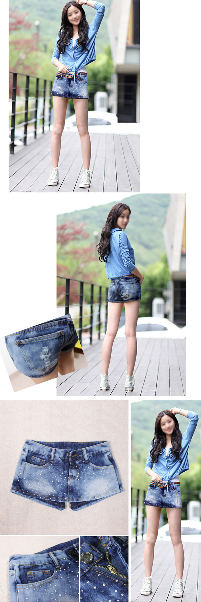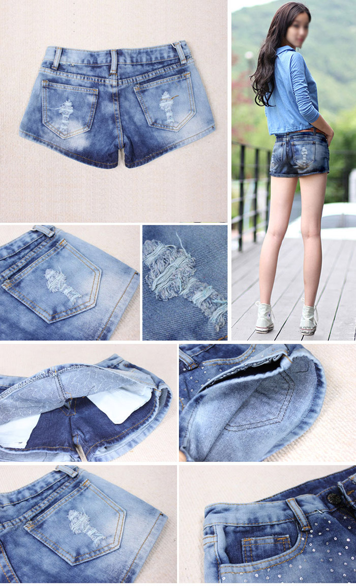 Amanda49 Mix Match Sequin Scratch Embellished Low Waist Layered Blue Short Jeans For Women |