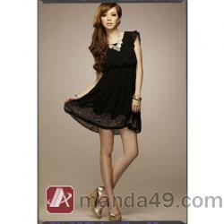Amanda49 OL Simple Style Black Chiffon with Lace Short Sleeve Dress--Women's Dresses |