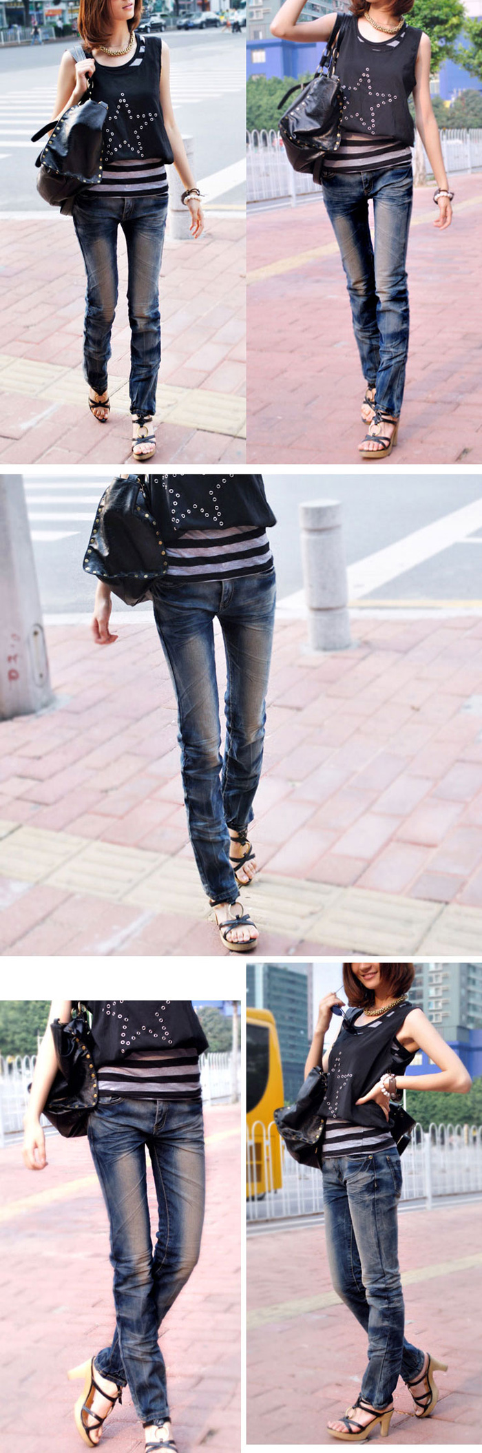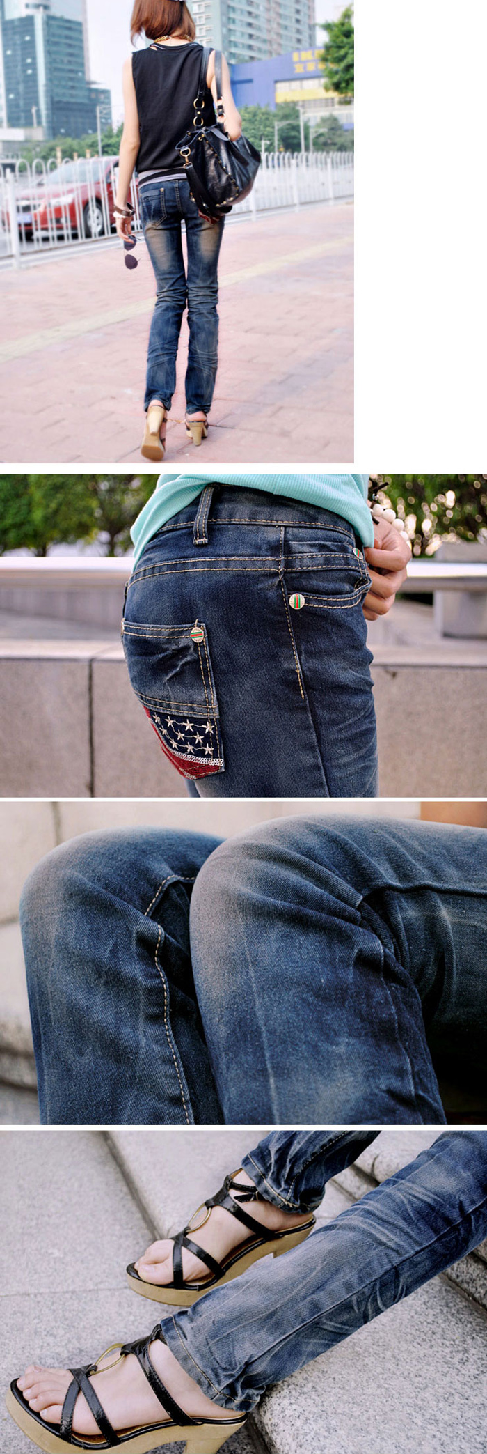 Amanda49 Slim American Flag Style Back-Pocket Frills Blue Elastic Feet Jeans For Women |