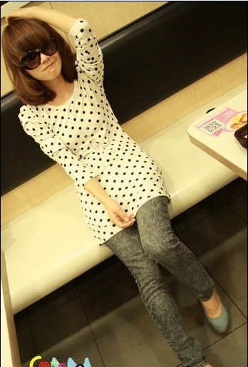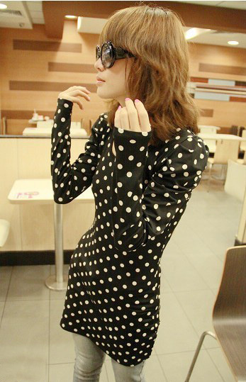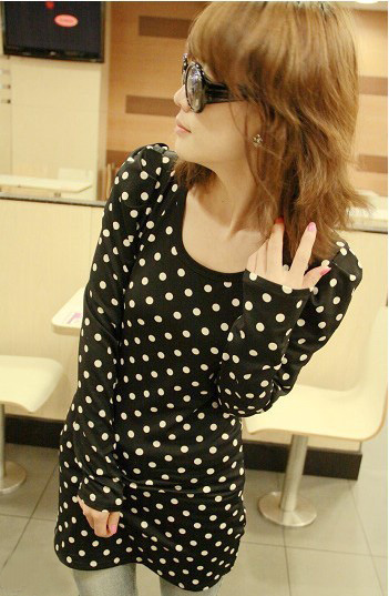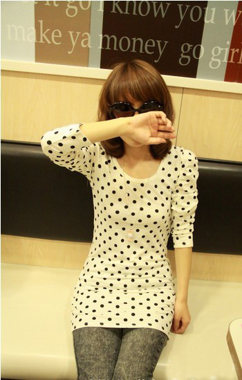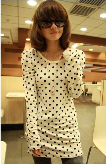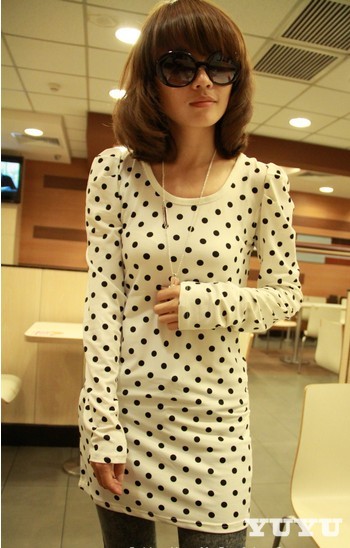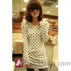Amanda49 Slim and Refreshing Round Neckline Dots Patterns Puff Long Sleeves Milk Silk Blouse For Women |