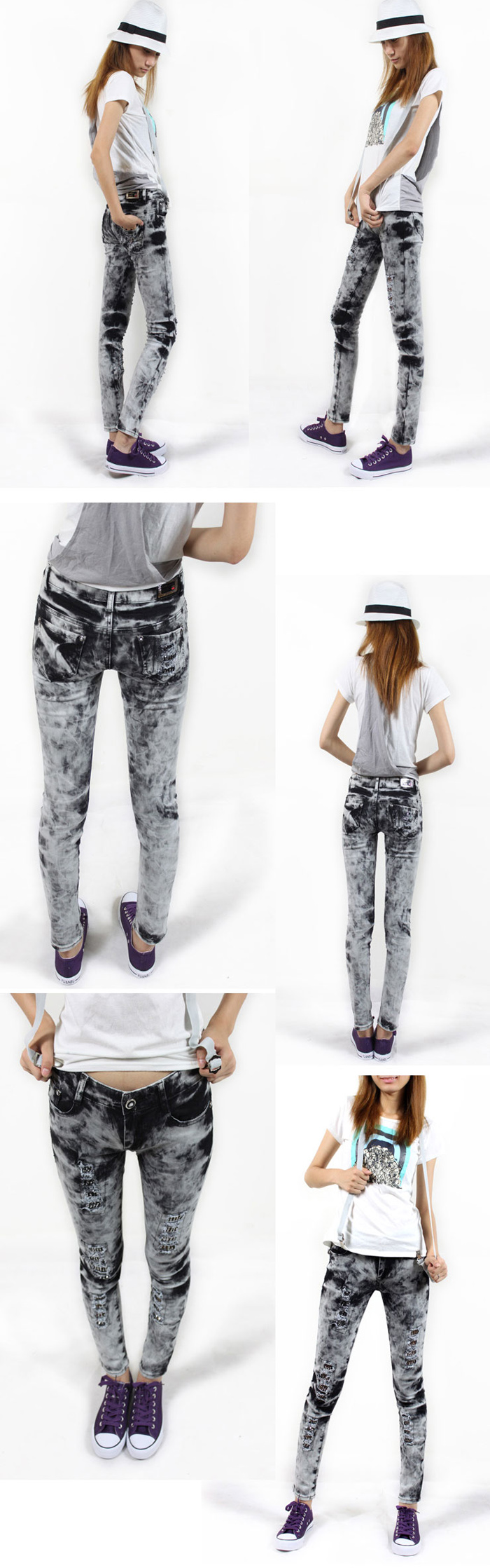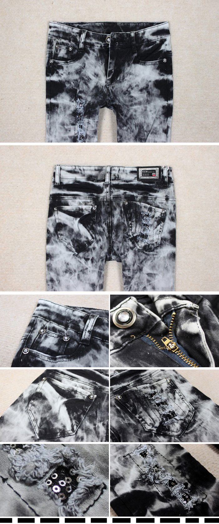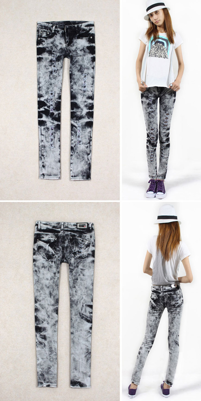Amanda49 Snow Broken Hole Style Sequin Embellished Black Jeans For Women |