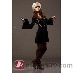 Amanda49 Special Gathered Design Loose Black Puff Sleeves Dress--Women's Dresses |