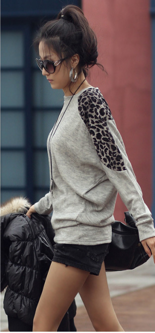 Amanda49 Stylish and Comfortable Leopard Embellished Shoulder Long Blouse |