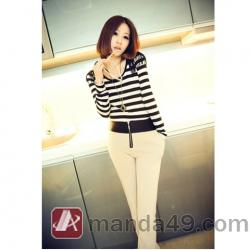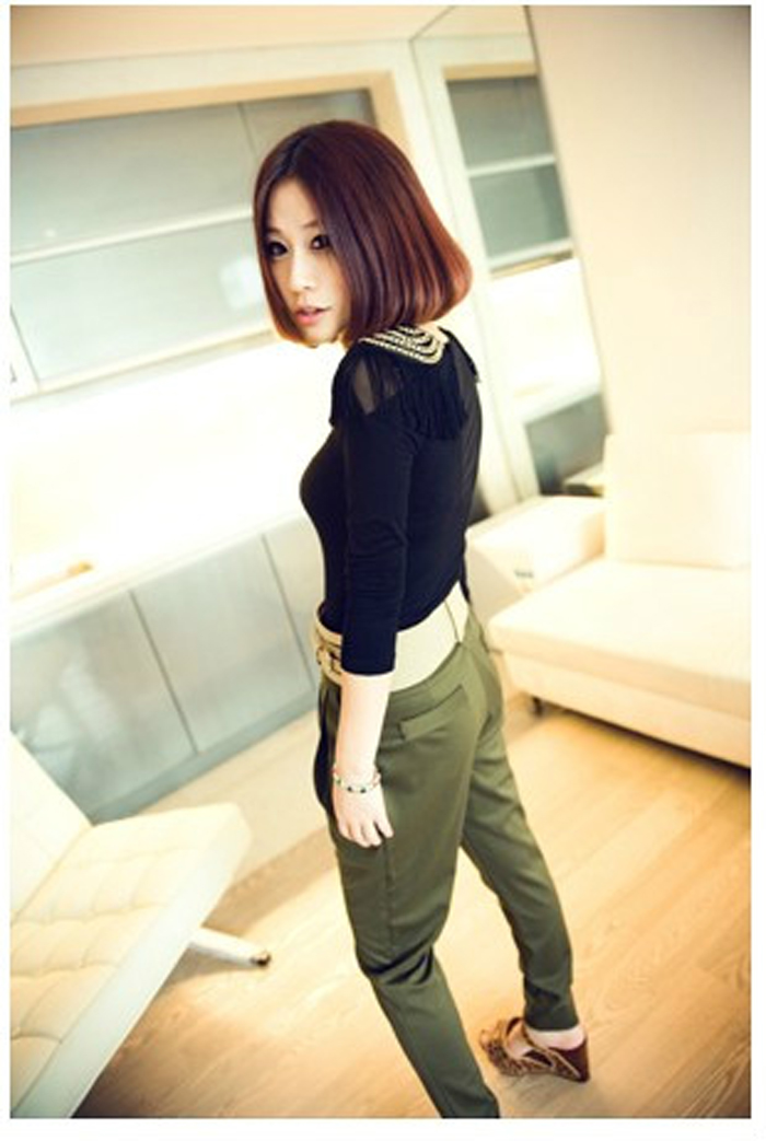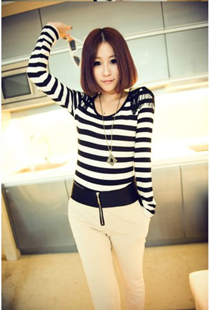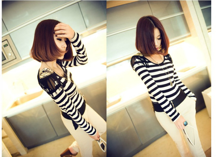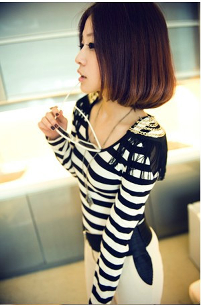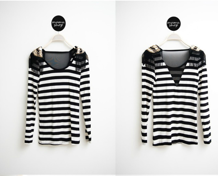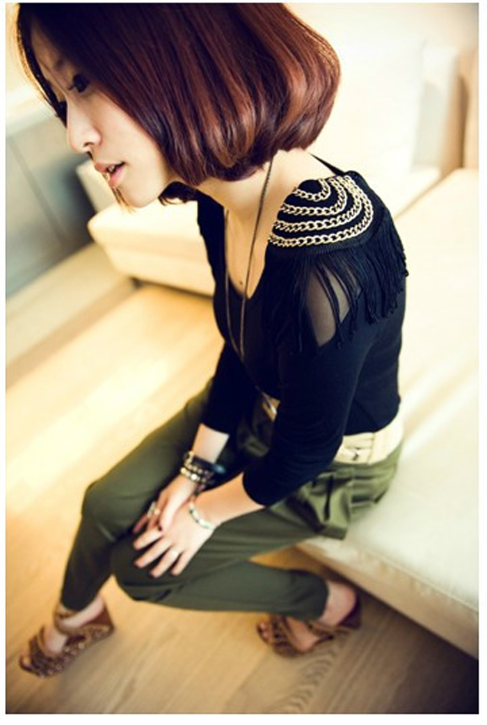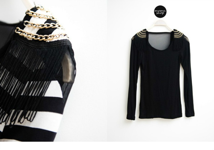 Amanda49 Stylish and Slim Tassel Embellished Shoulder Cotton + Net Yarn Short Sleeve Blouse |