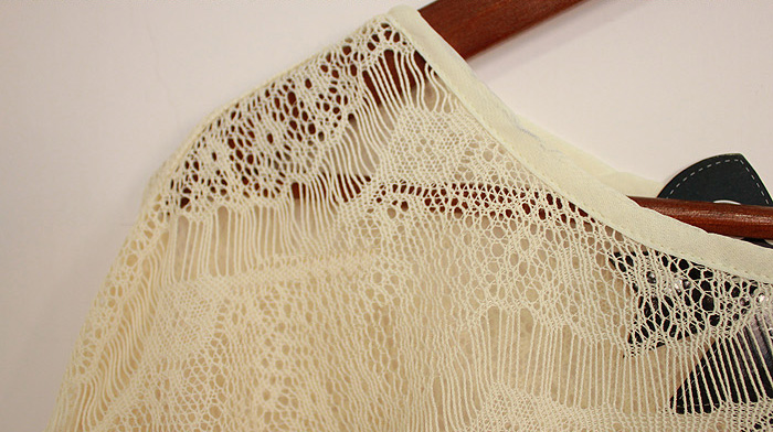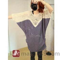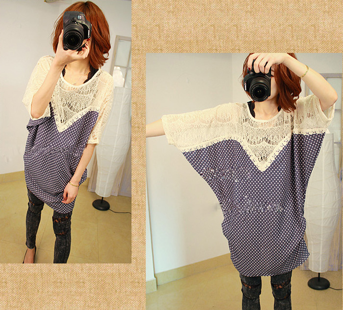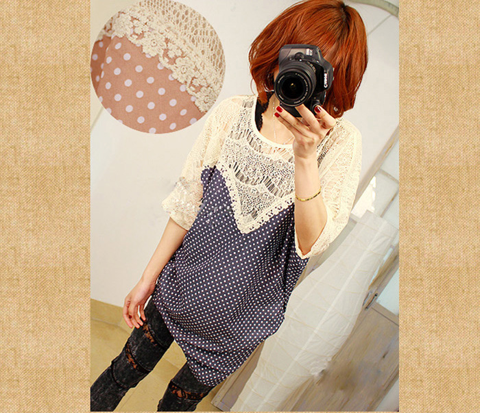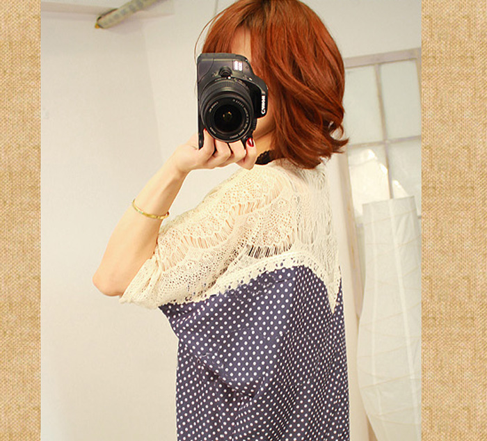 • Amanda49 Stylish Bat Sleeves Lace and Polka Dot Short Sleeve Blouse