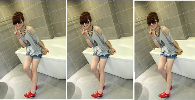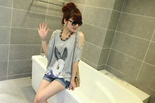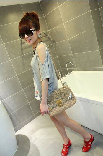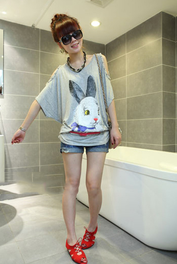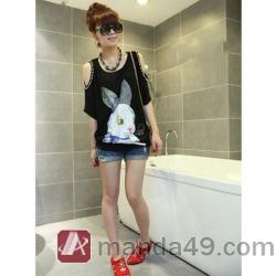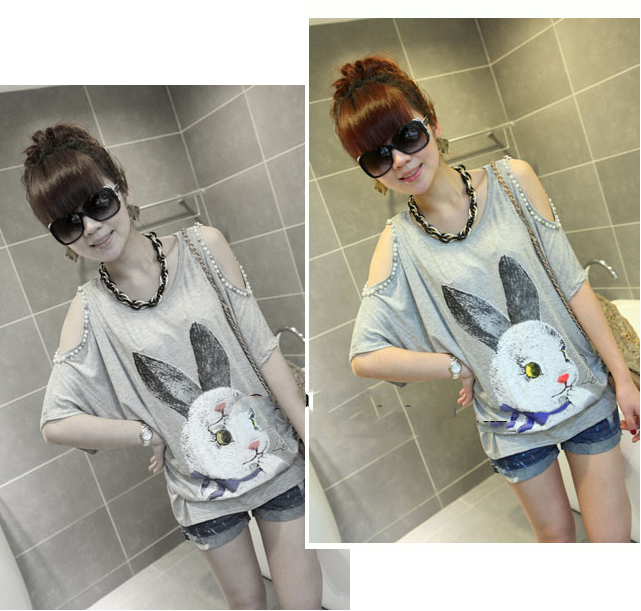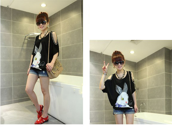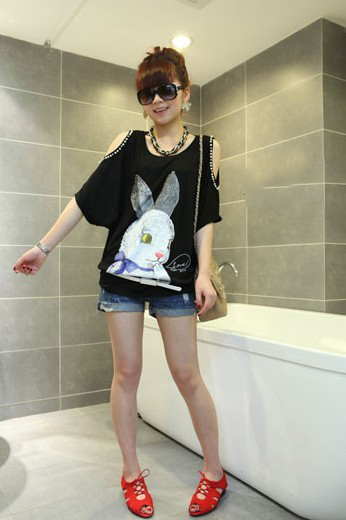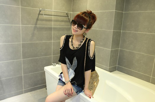 Amanda49 Stylish Sewing Rubbit Jewel Embellished Off-Shoulser Short Sleeve Blouse |