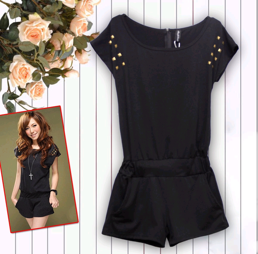 Amanda49 Summer New Arrival Fashionable Round Neckline Rivets Embellished Shoulder Short Sleeve Jumpsuit |