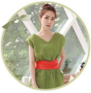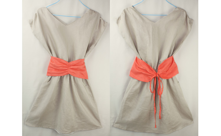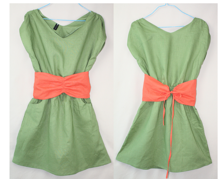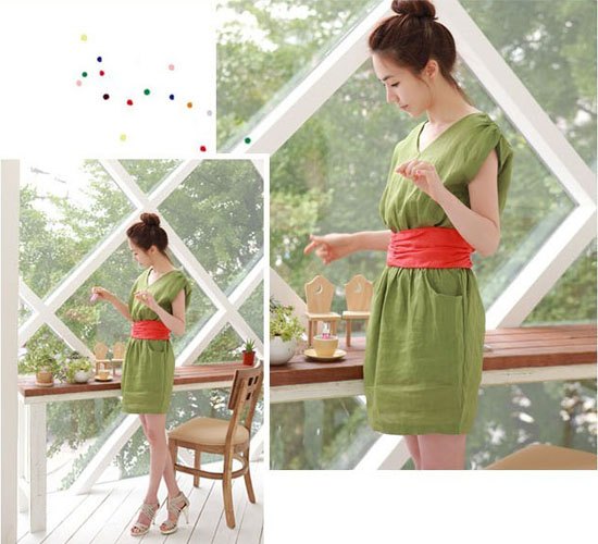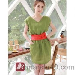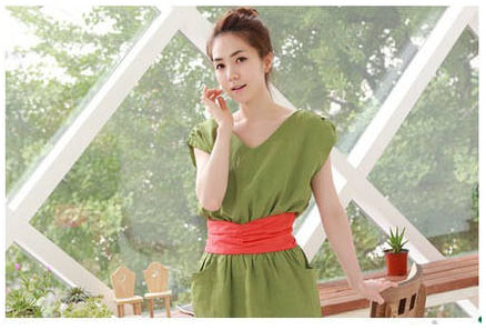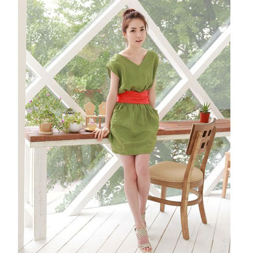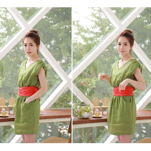 Amanda49 Sweet and Comfortable V-Neck Short Sleeves Linen Dress With Belt--Women's Dresses |