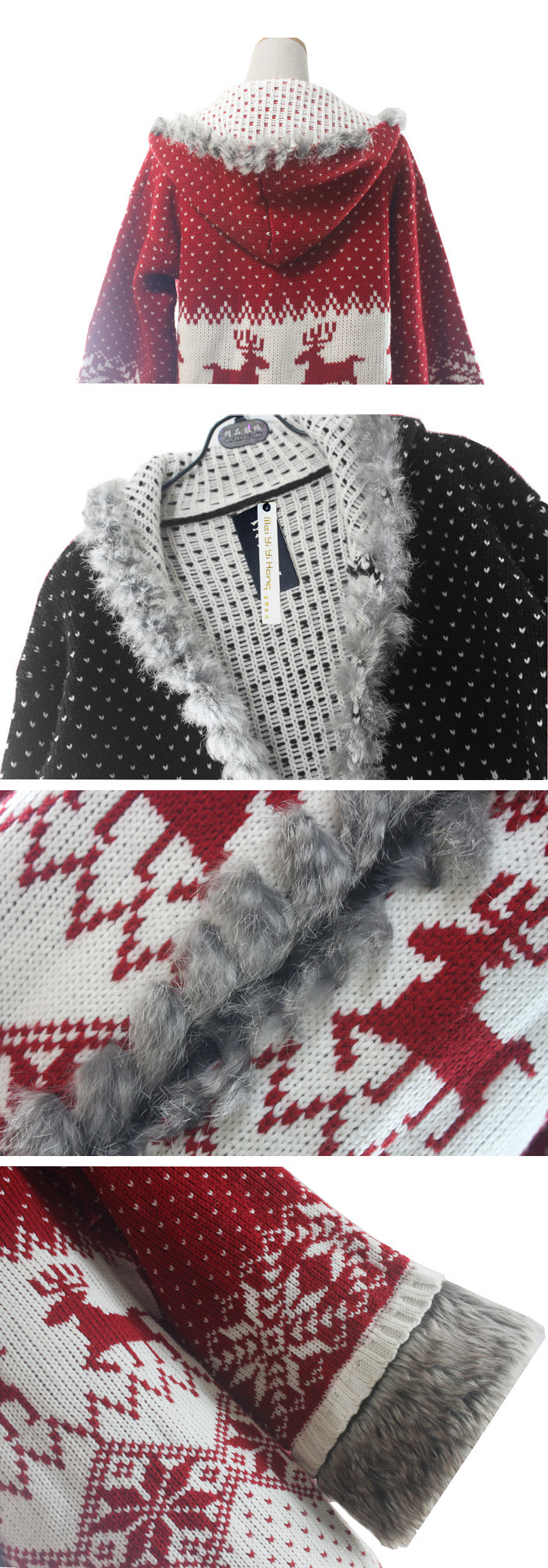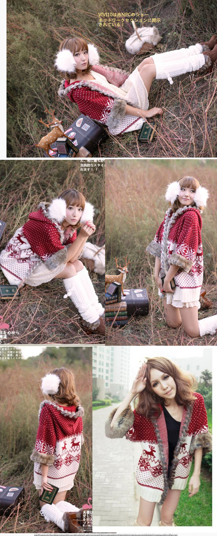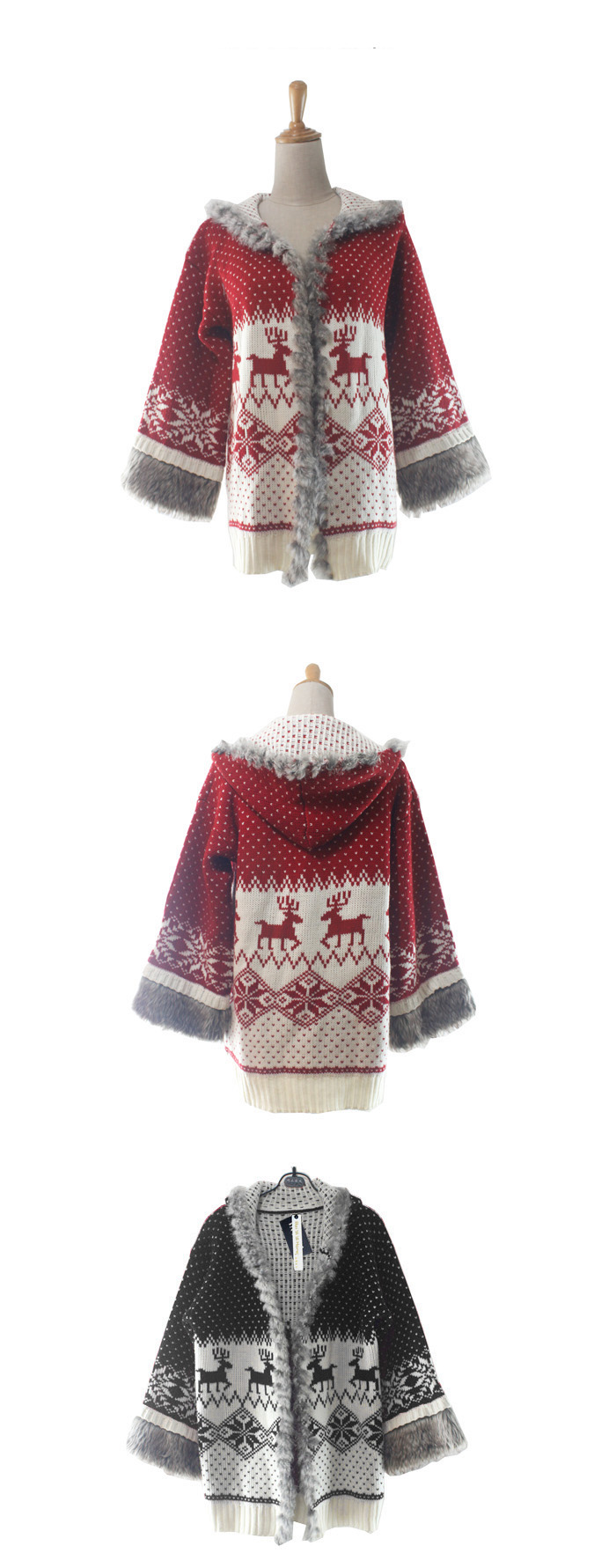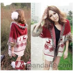 Amanda49 Sweety and Charming Rough Selvedge Christmas Deer Dots Patterns Red Long Sleeves Acrylic+Fibre Hair Hood Coat For Women |