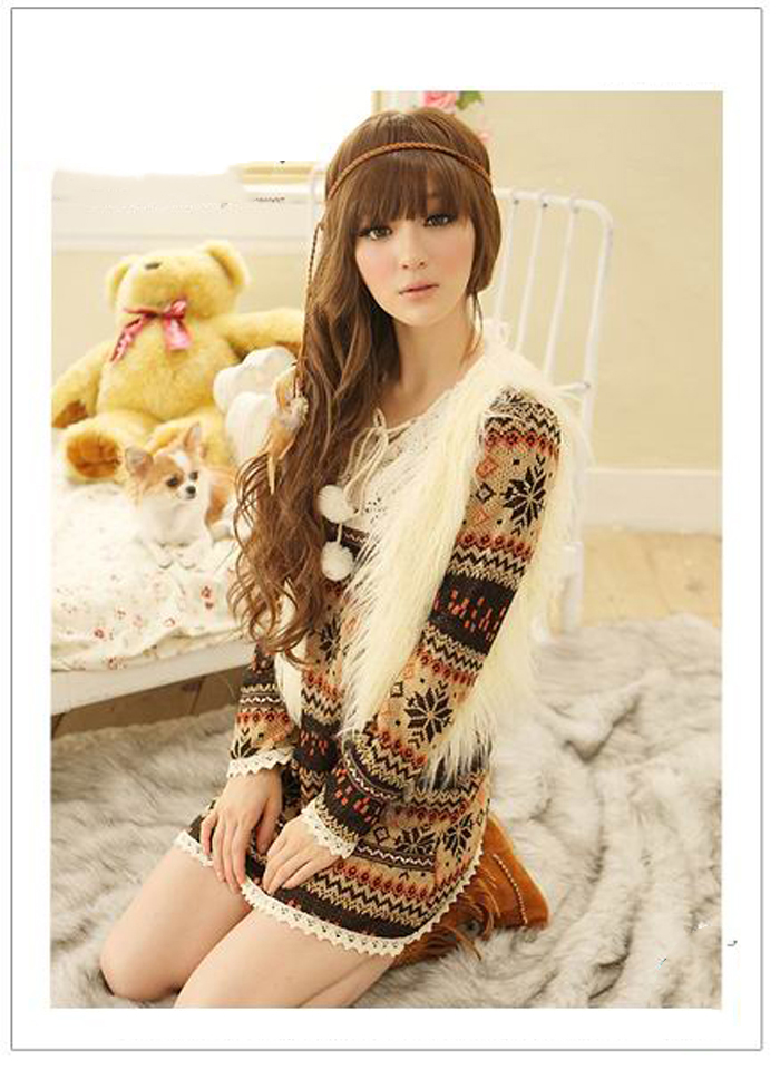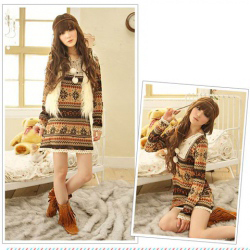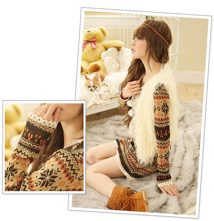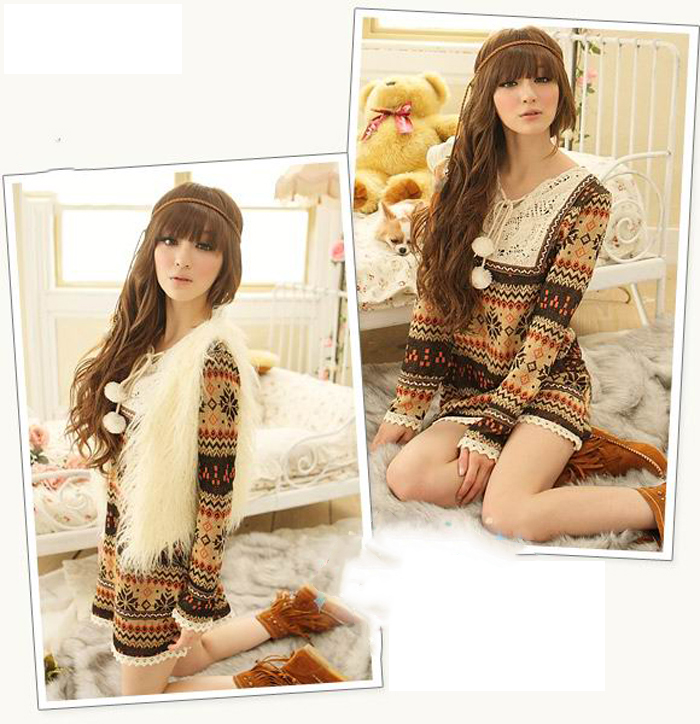 Amanda49 Sweety Snow Patterns V-Neck Lace Hem Long Sleeves Dress For Women |
