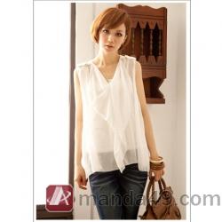 Amanda49 V-neck Shoulder-embellished Button White Chiffon Sleeveless Blouse--Women's Blouses |