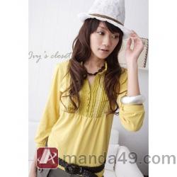 Amanda49 V-Neck with Collar Special Button Design Yellow Half Sleeves Blouse--Women's Blouses |
