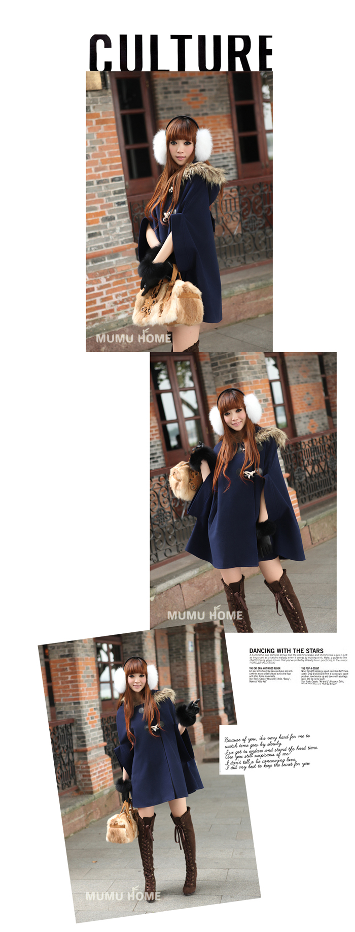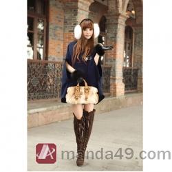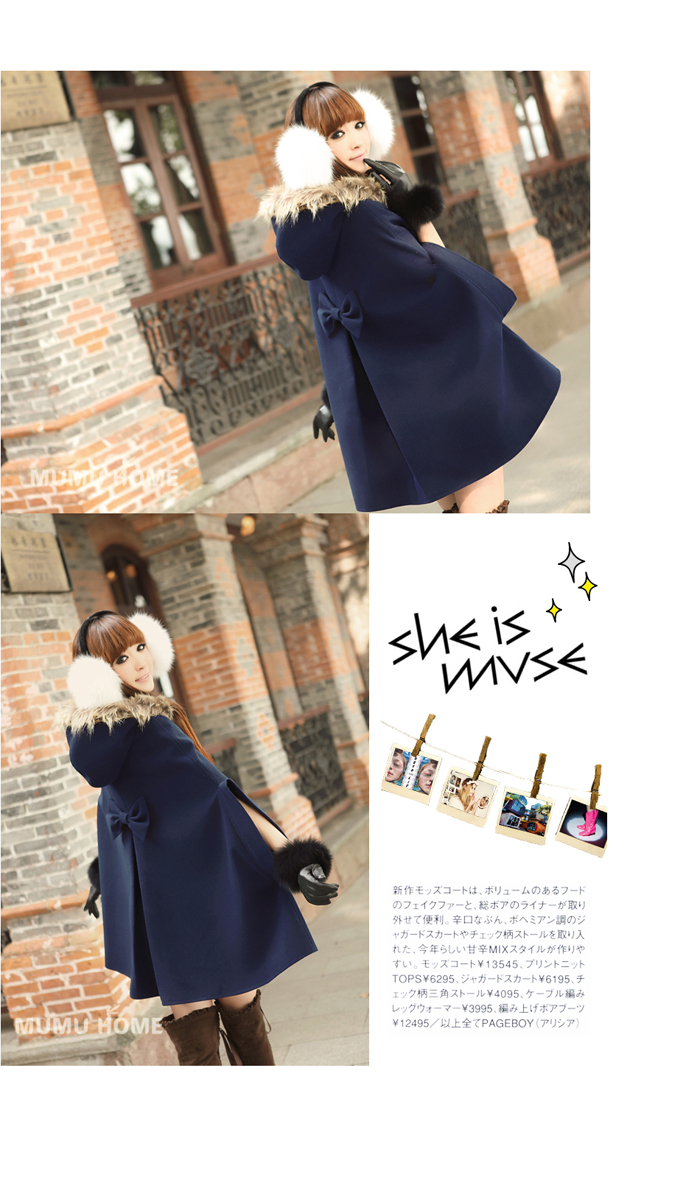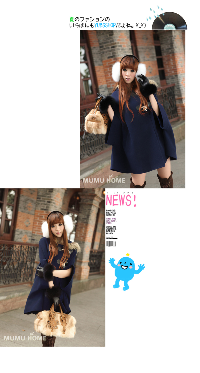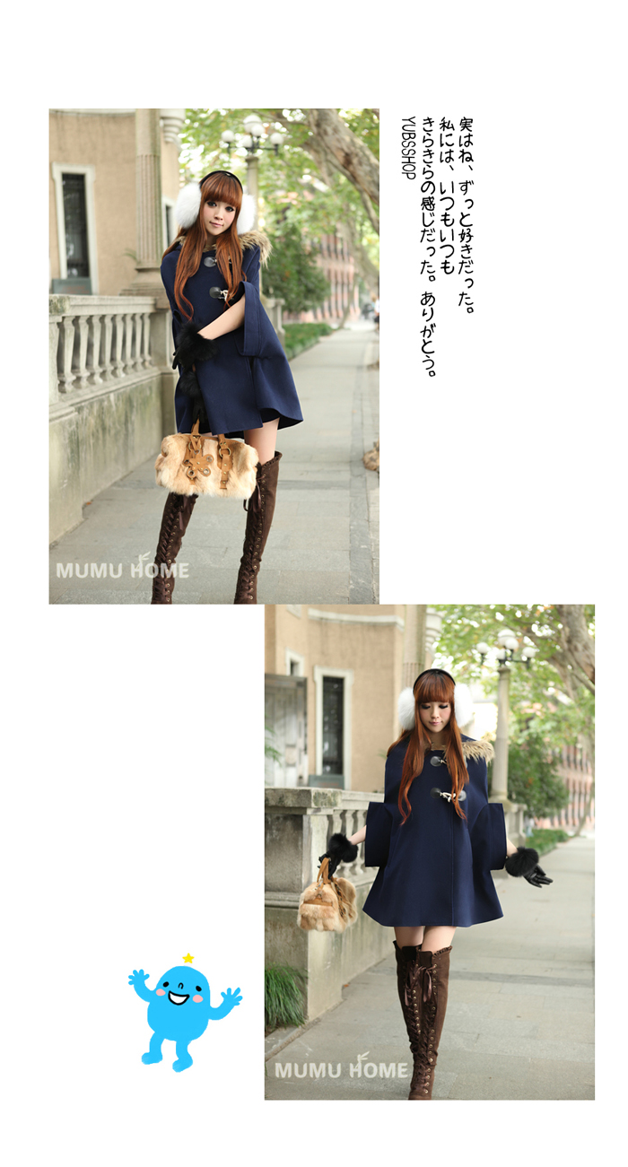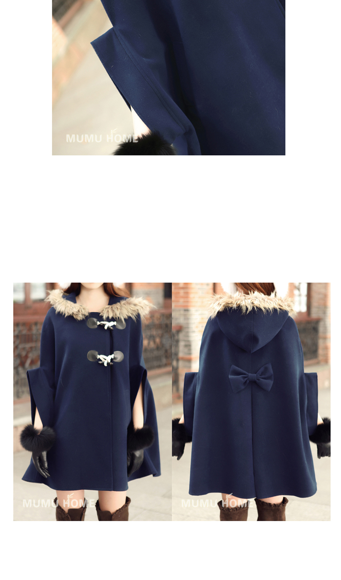 Amanda49 Warm-Keeping and Cute Shearling Bowknot Embellished Navy Quarter Sleeves Hood Cloak For Women |