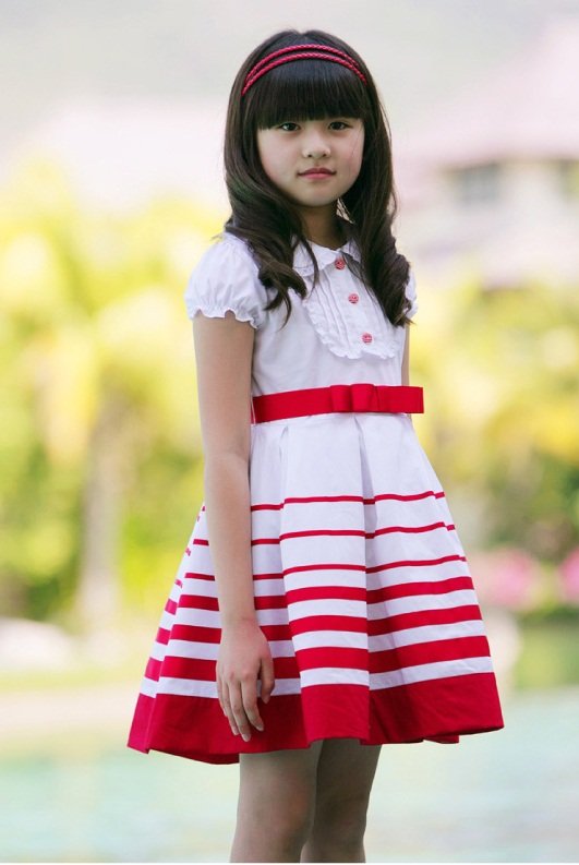 Girls Pure Cotton Red Stripes White Lapel Knee Length Skirt |