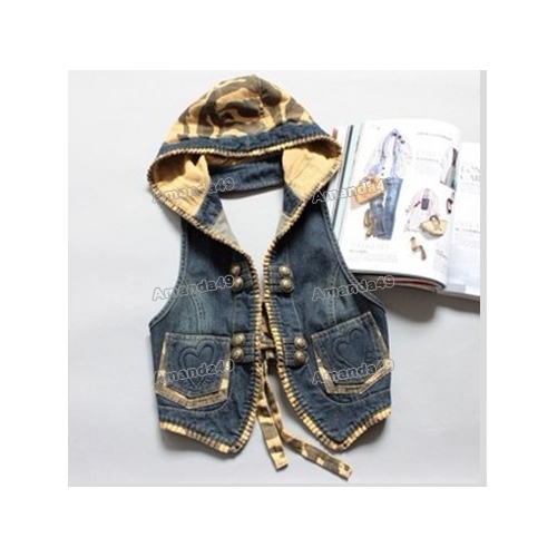 Korean Blue Double-breasted Hooded Waistcoats Denim Slim Female Vest |