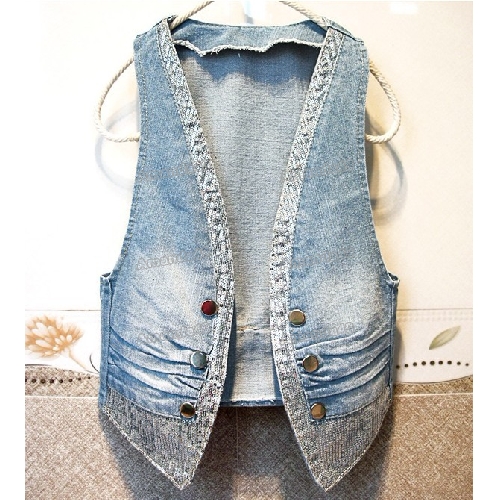 Korean Fashion Light Blue Sequins Summer Waistcoats Denim Slim Female Vest |