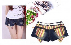 Ladies Wrinkled Pattern Color Stripe Exposed Pocket Dark Blue Short Jeans |