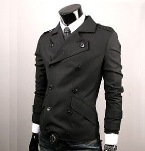 Men's Slim Fit Double Breast Cotton Blend Lapel Black Trench Coat |