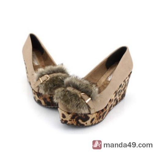 Western Style Plush Belt Buckle High-heeled Leopard Platform Wedge Shoes |