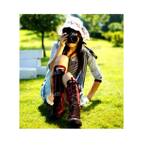 Women's Canvas Flat Lattice Lace-up Height Increasing Knee High Boots |