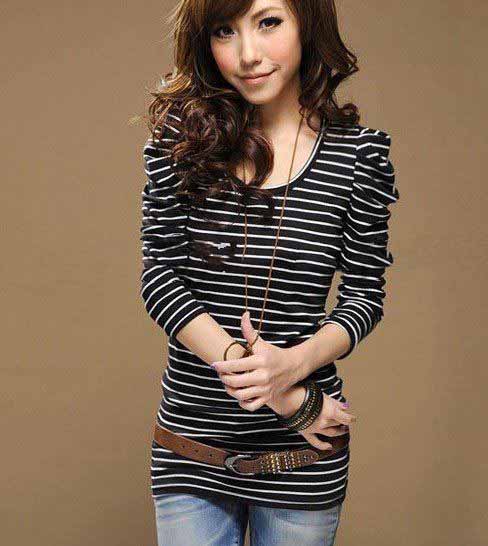 Women's Good Elastic Puff Long Sleeve Top Wear O-Neck T-Shirts |
