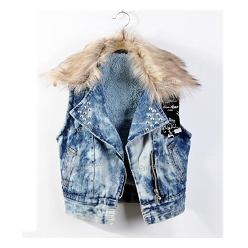 Zipper Blue Rivet Plus Velvet Retro Detachable Fur Collar Korean Cowboy Waistcoats |